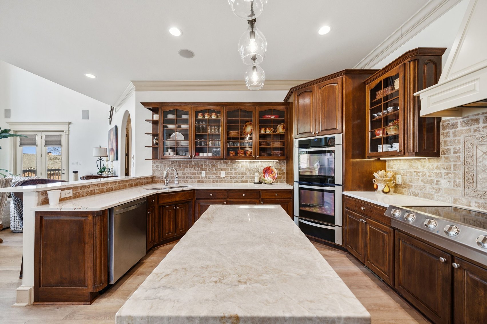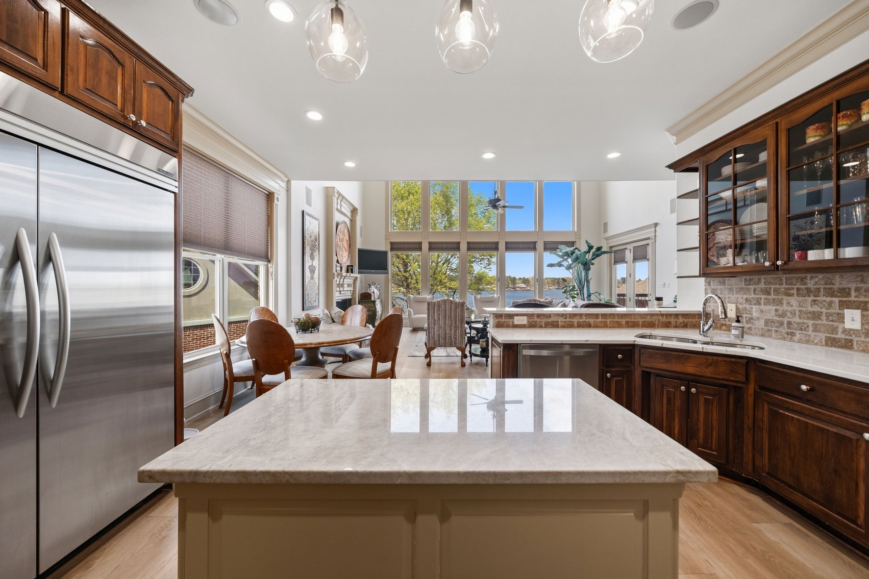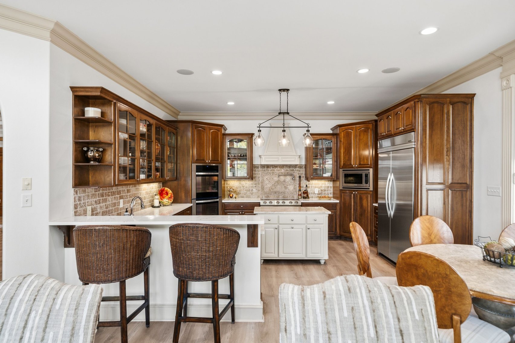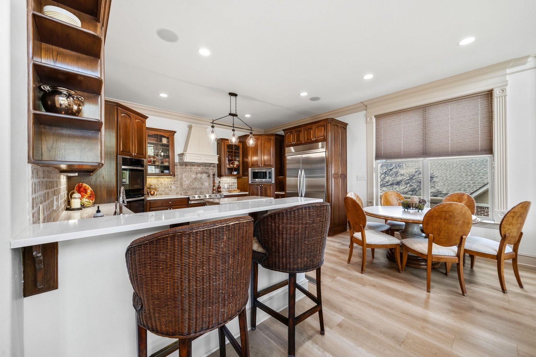 - Elegant Chef's Eat-in Kitchen w/Top of the Line S/S Appliances, Custom Cabinetry, Breakfast Bar & Kitchen Island