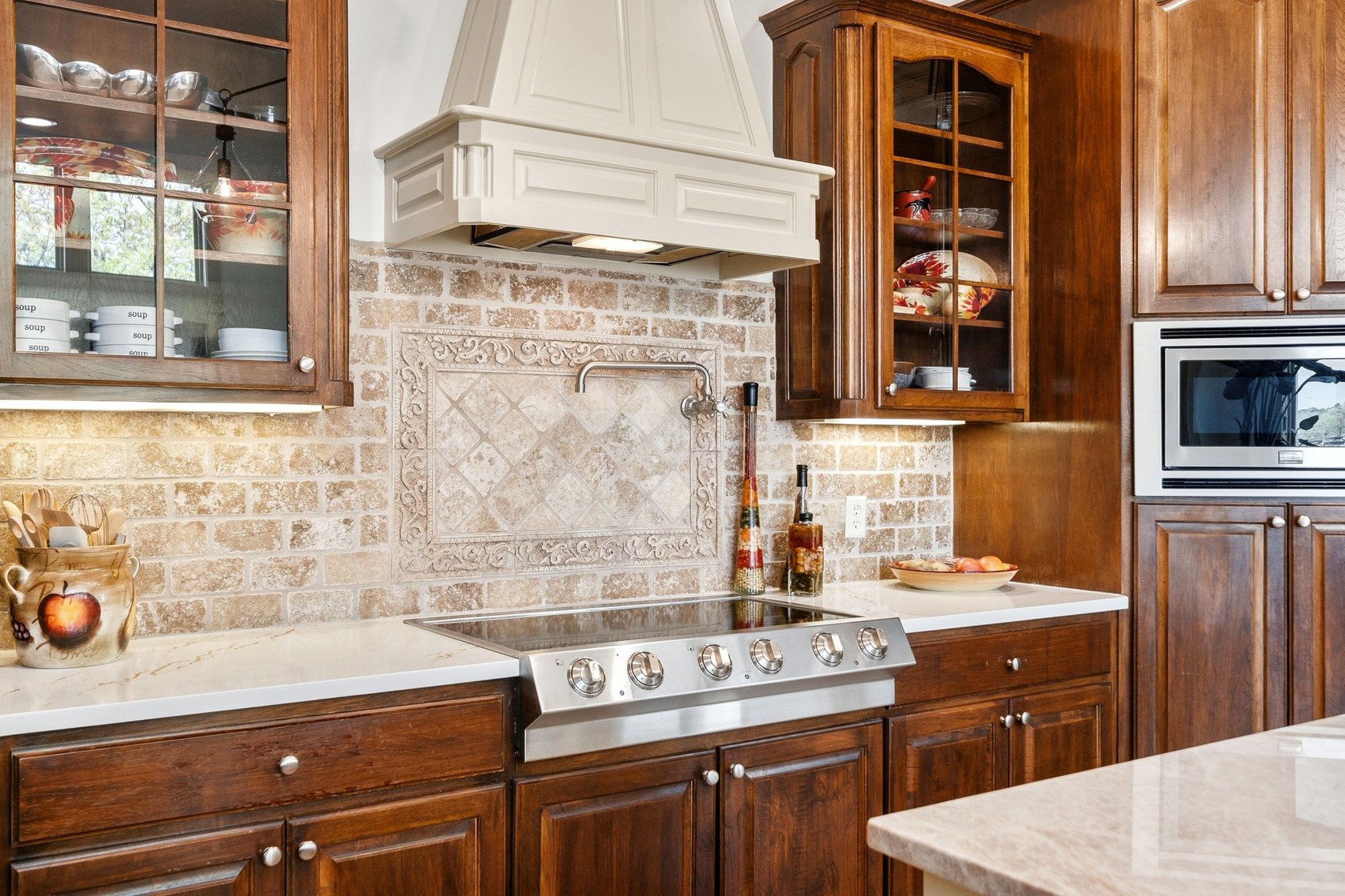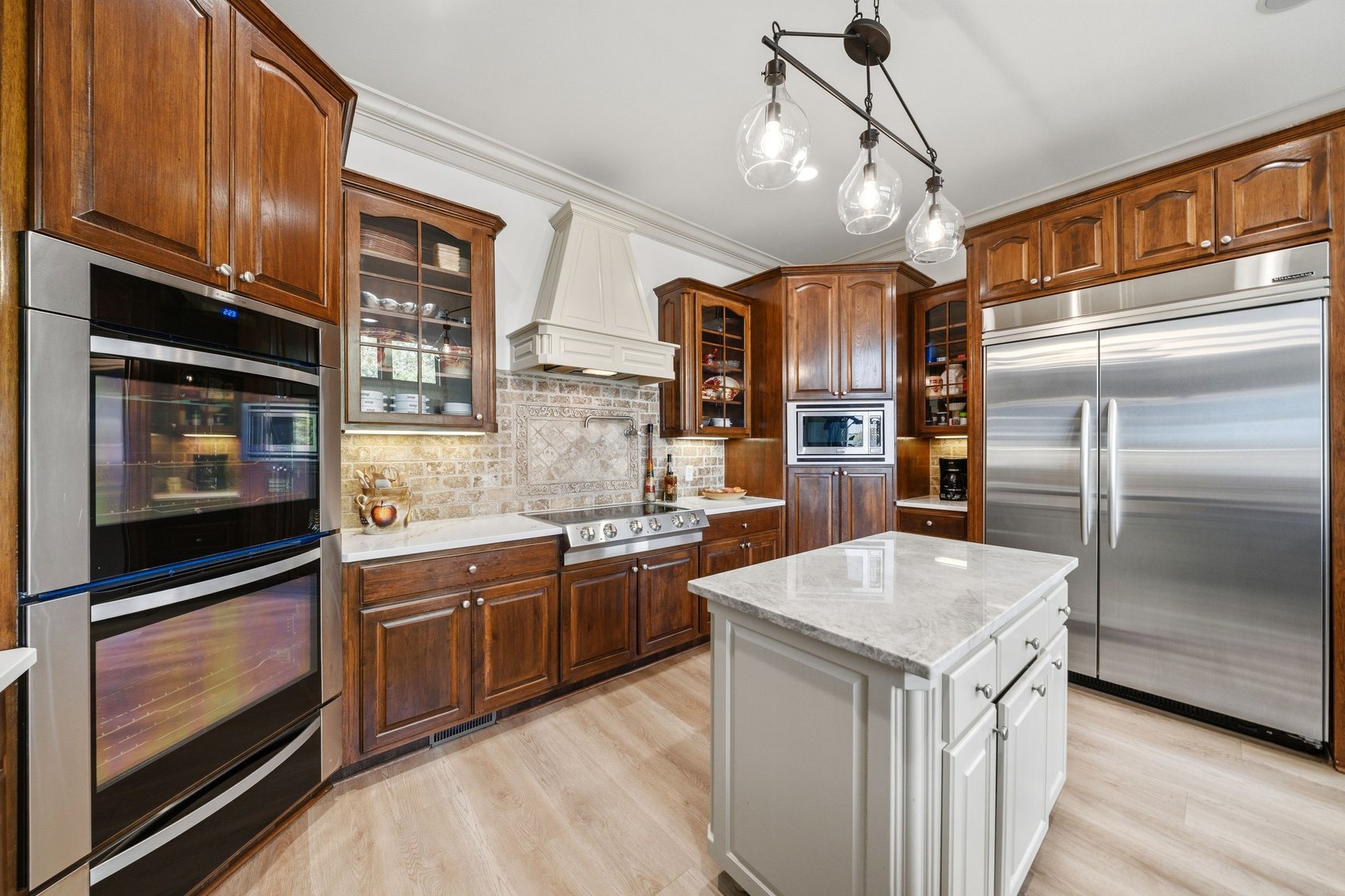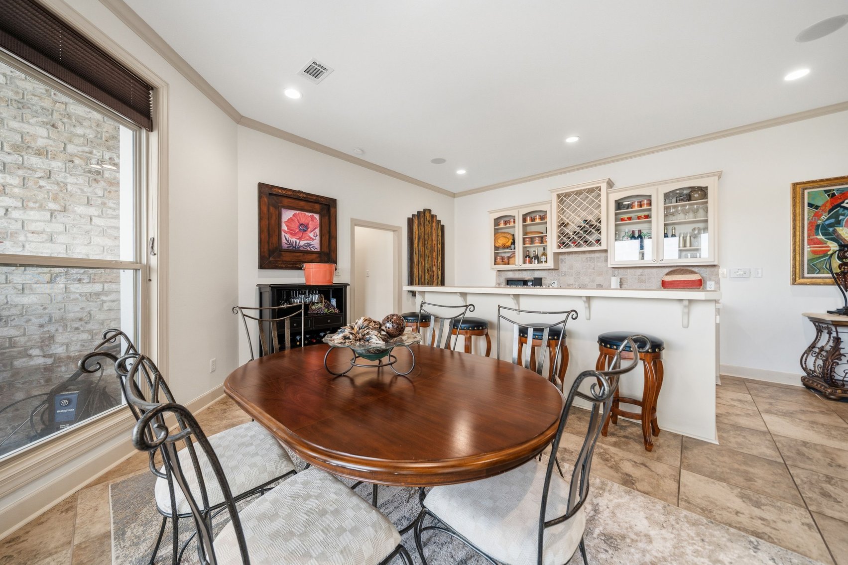 - Elegant Chef's Eat-in Kitchen w/Top of the Line S/S Appliances, Custom Cabinetry, Breakfast Bar & Kitchen Island