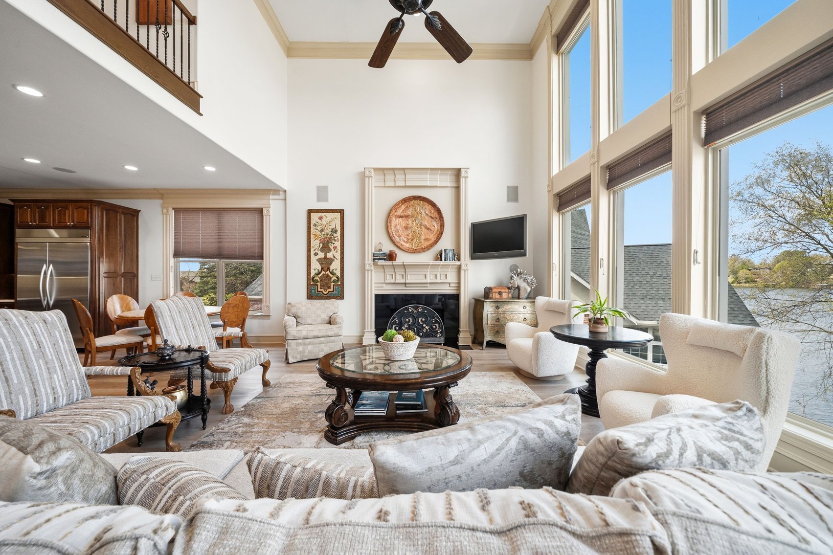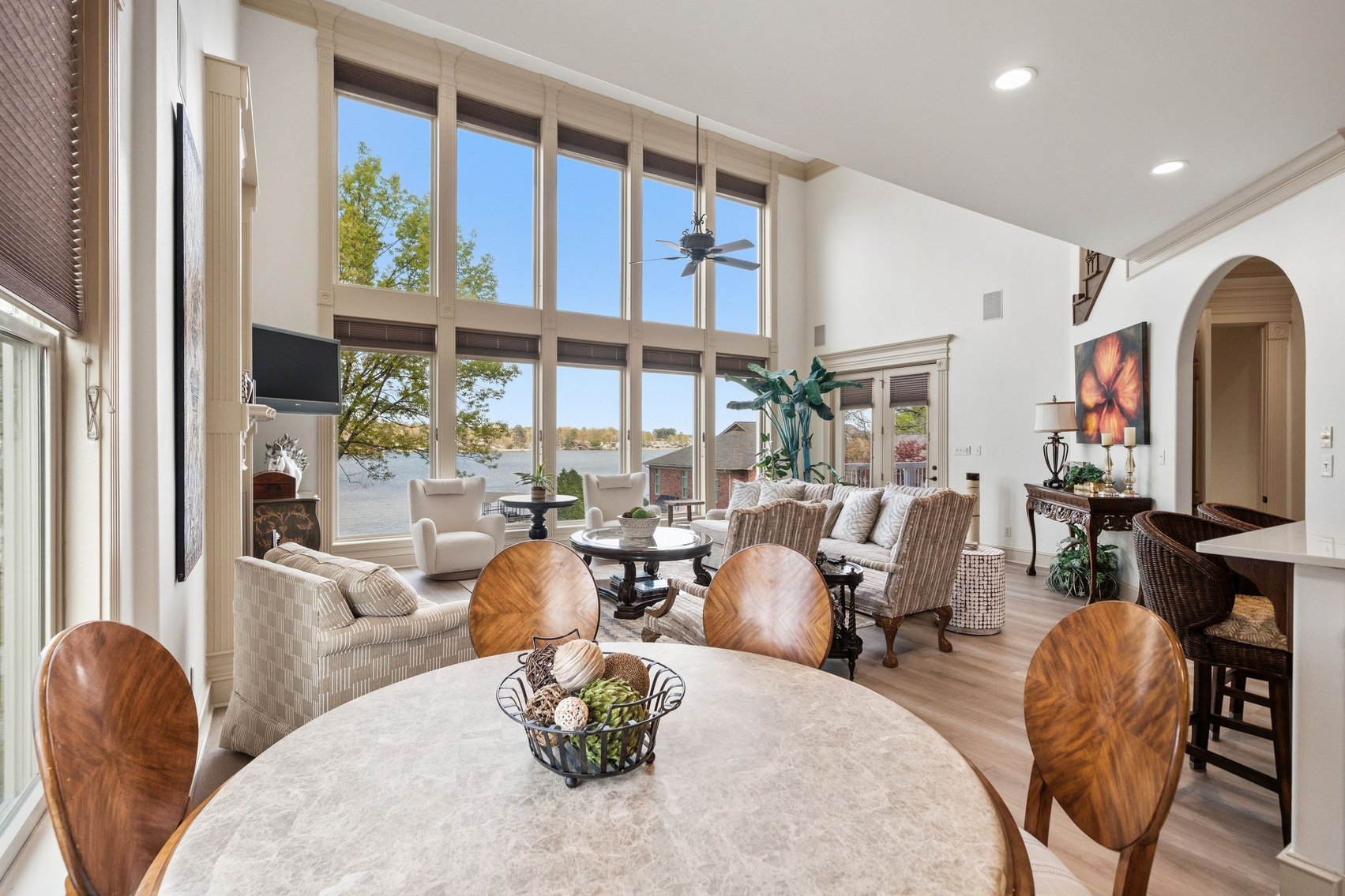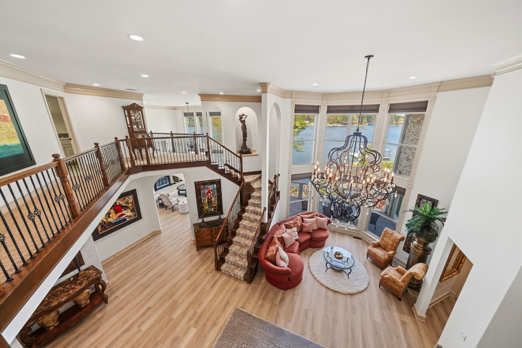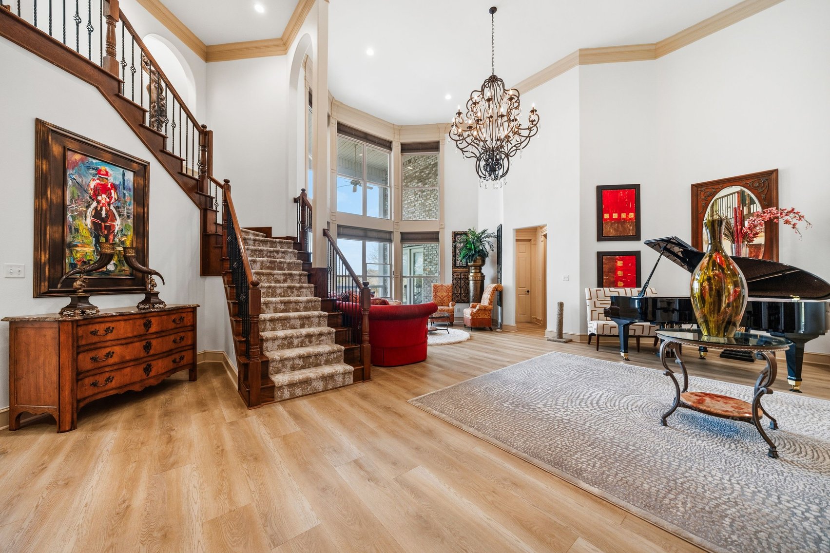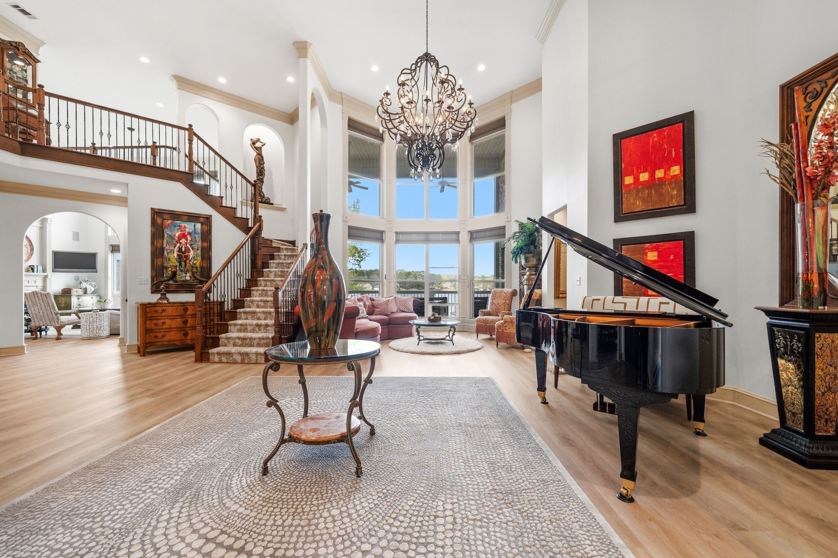 - Spacious, Inviting Living Room w/Sitting Area Overlooking the Lake, High Vaulted Ceiling, Impressive Chandelier & Classic Black Baby Grand Piano