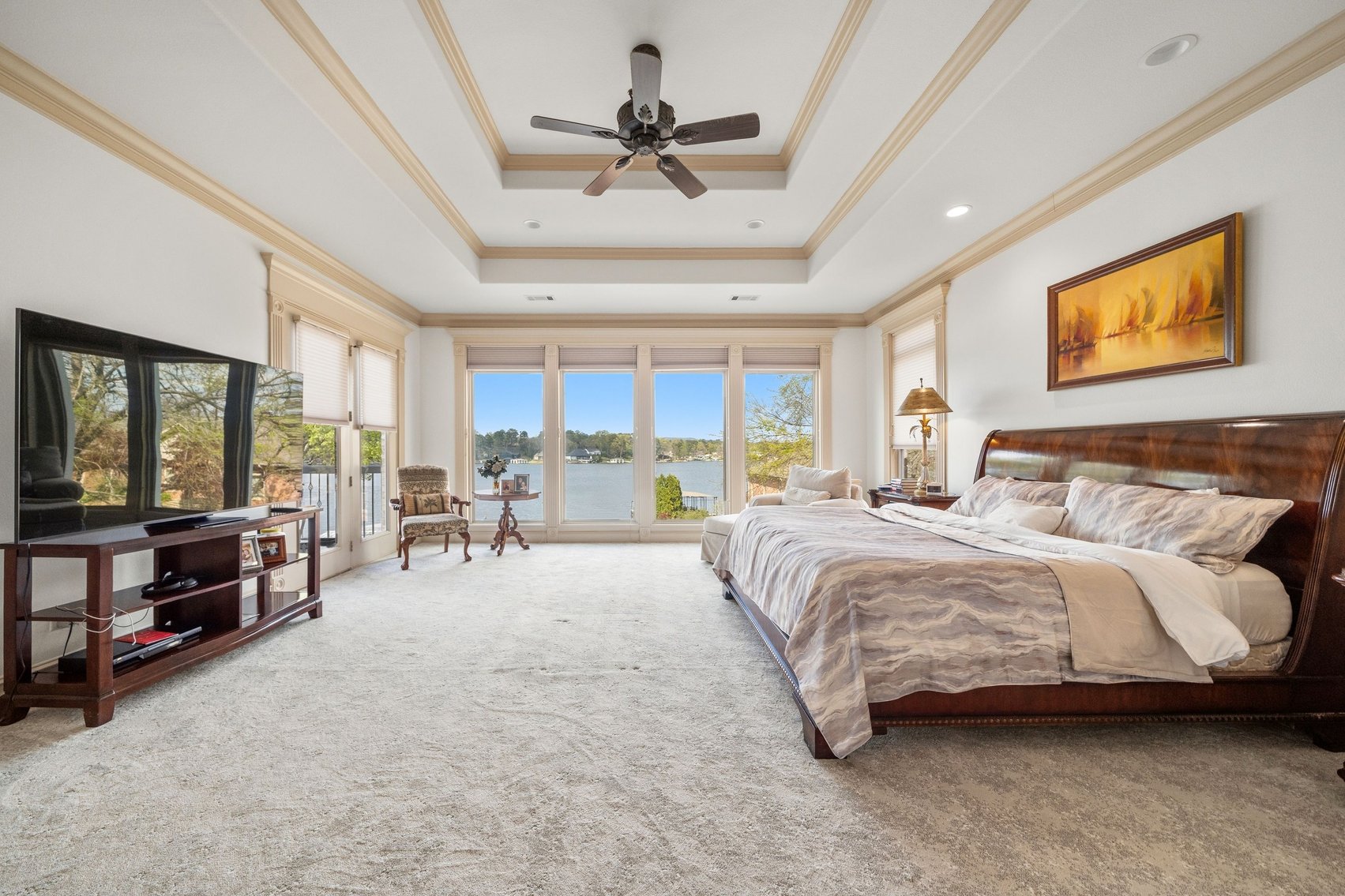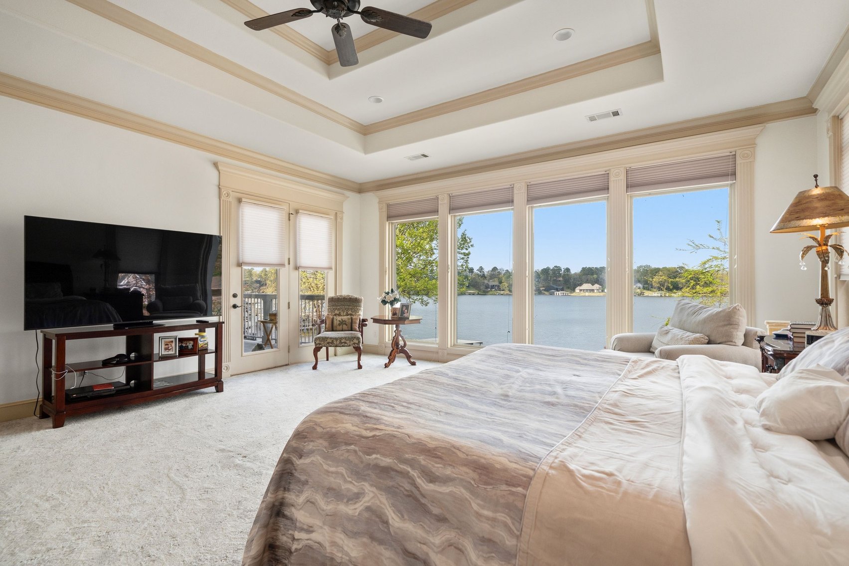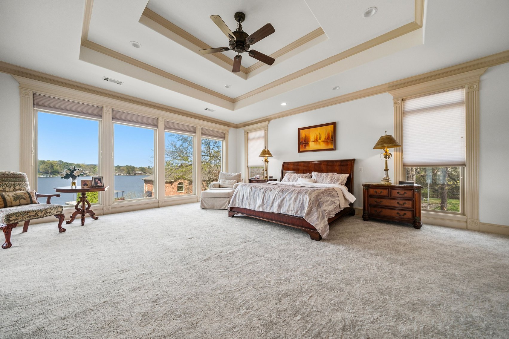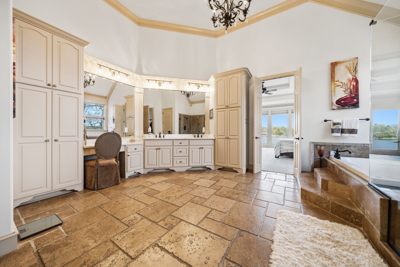 - Impressive Master Suite w/Tray Ceiling, Incredible Lake View & Private Bathroom w/Soaking Tub, Separate Tiled Shower, Dual Sink Vanity, Vanity Desk, Laundry Closet & Huge Walk-in Closet