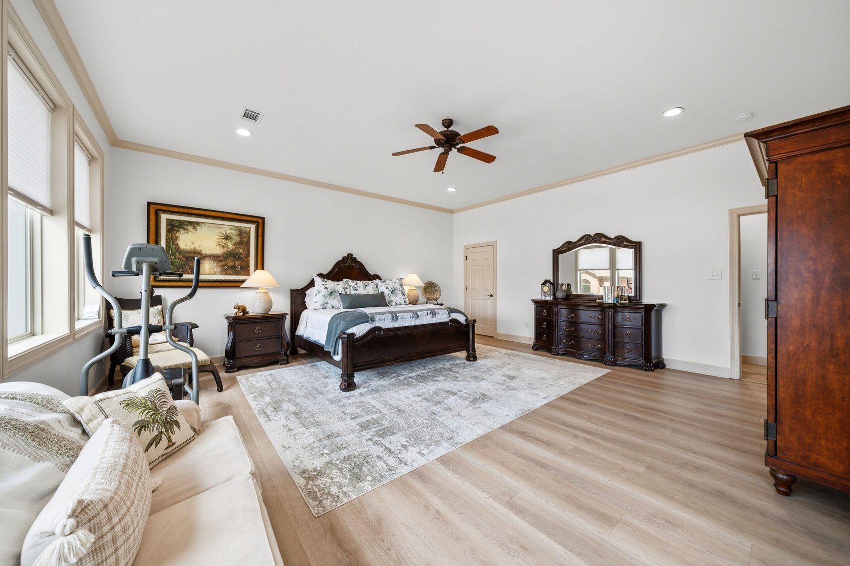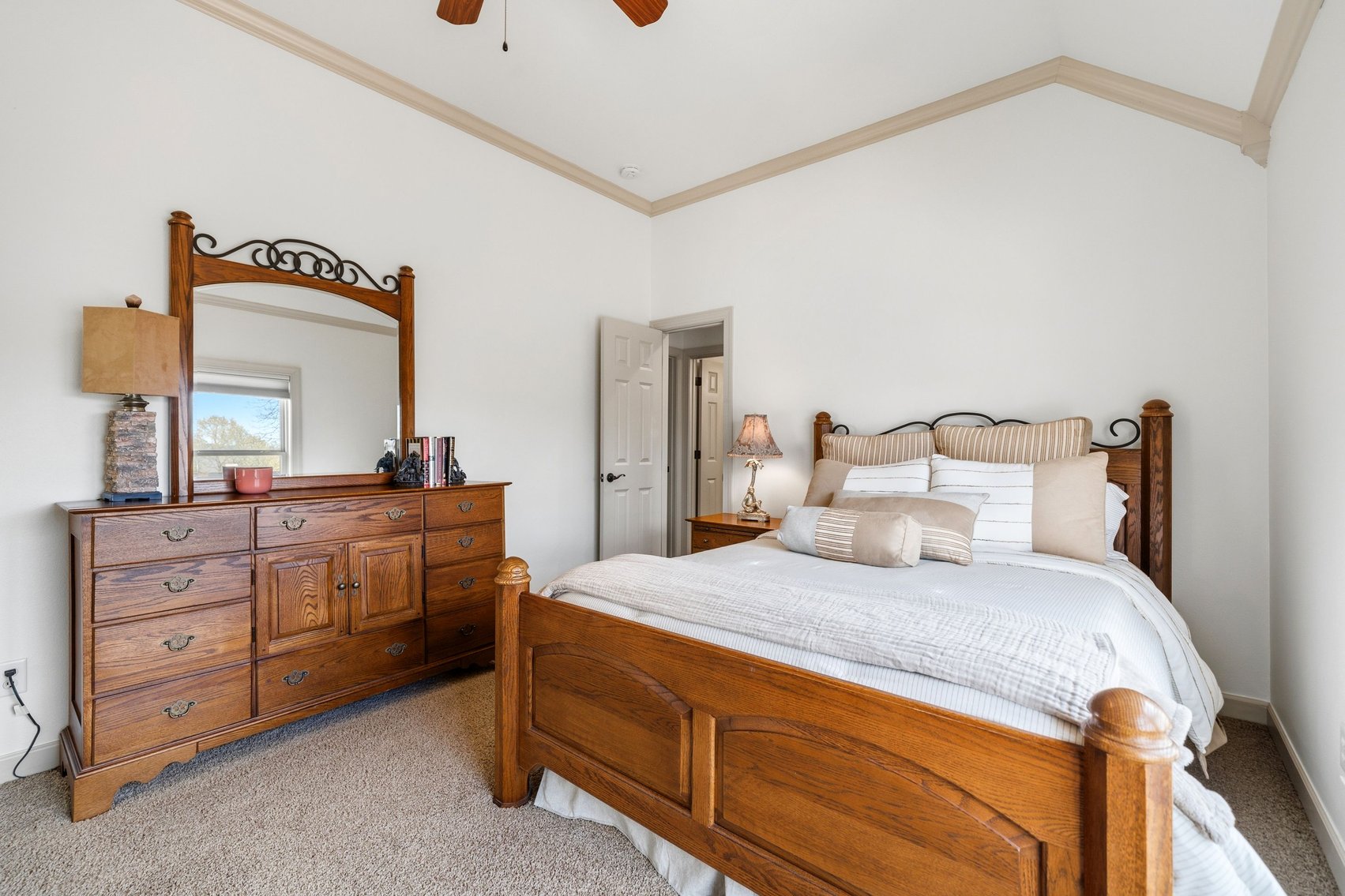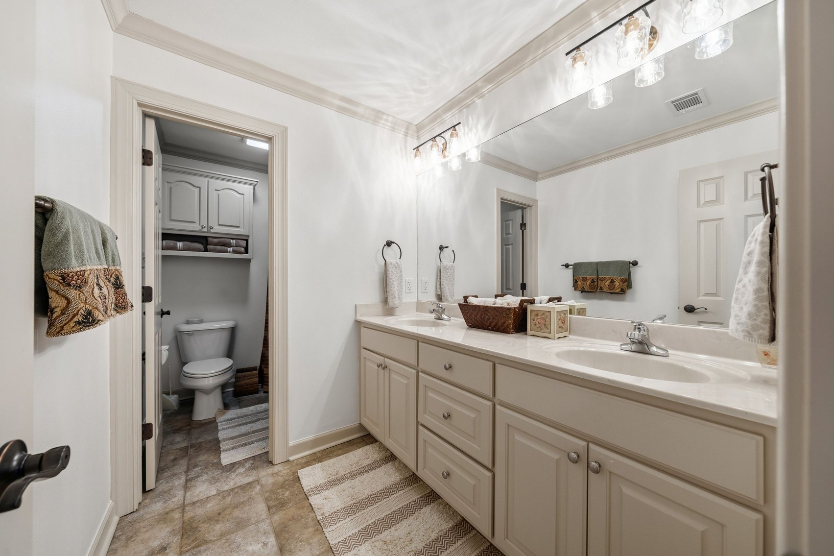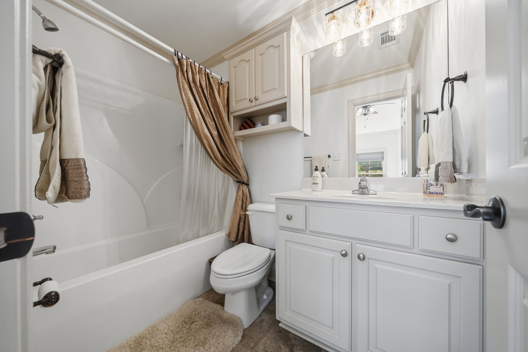 - Impressive Master Suite w/Tray Ceiling, Incredible Lake View & Private Bathroom w/Soaking Tub, Separate Tiled Shower, Dual Sink Vanity, Vanity Desk, Laundry Closet & Huge Walk-in Closet