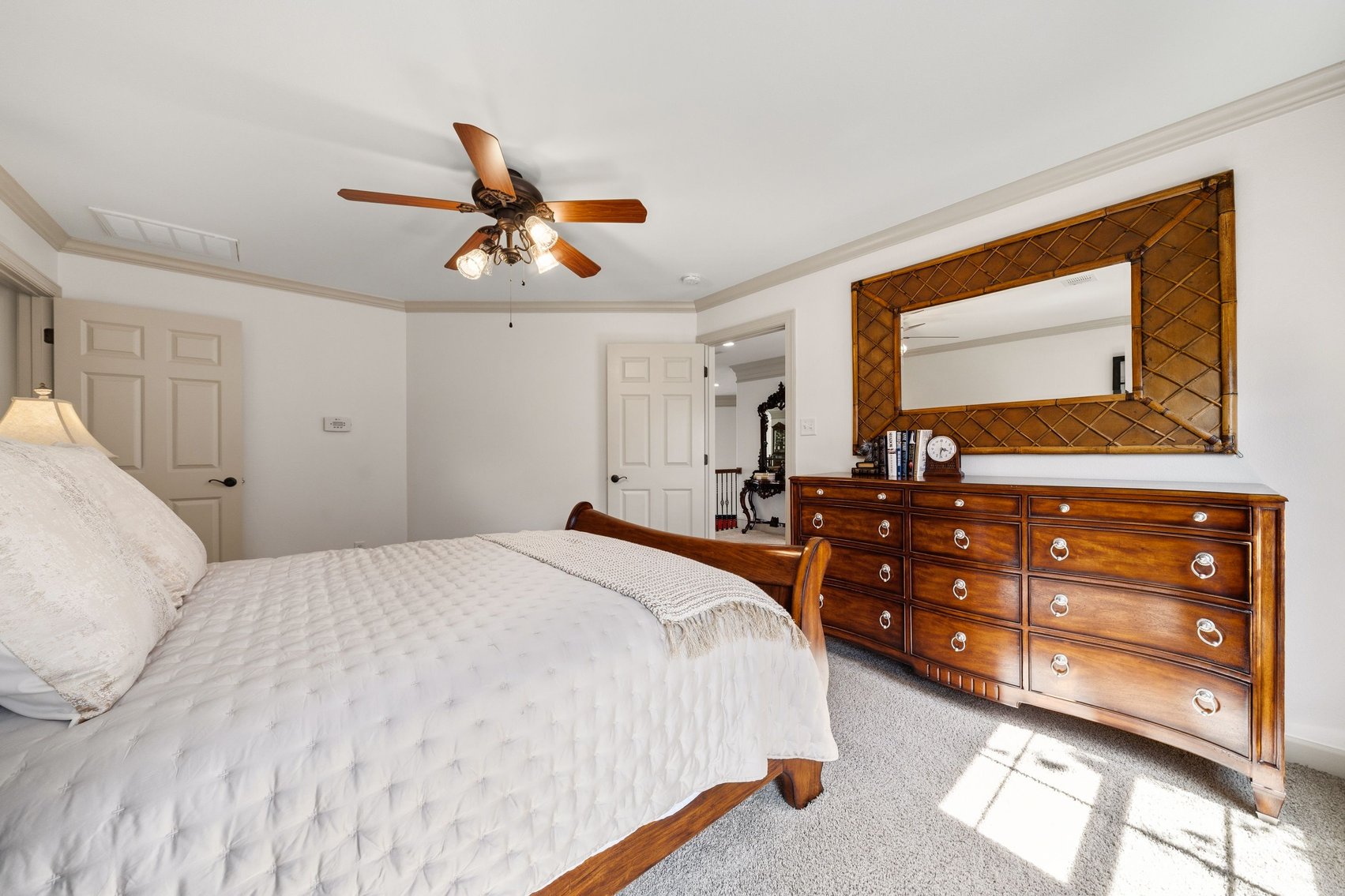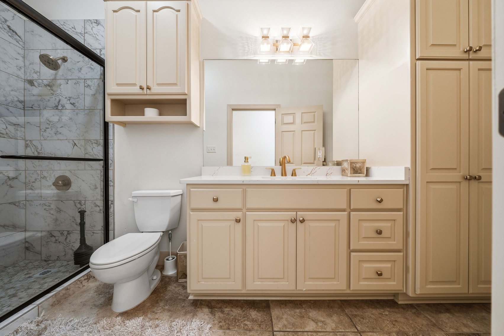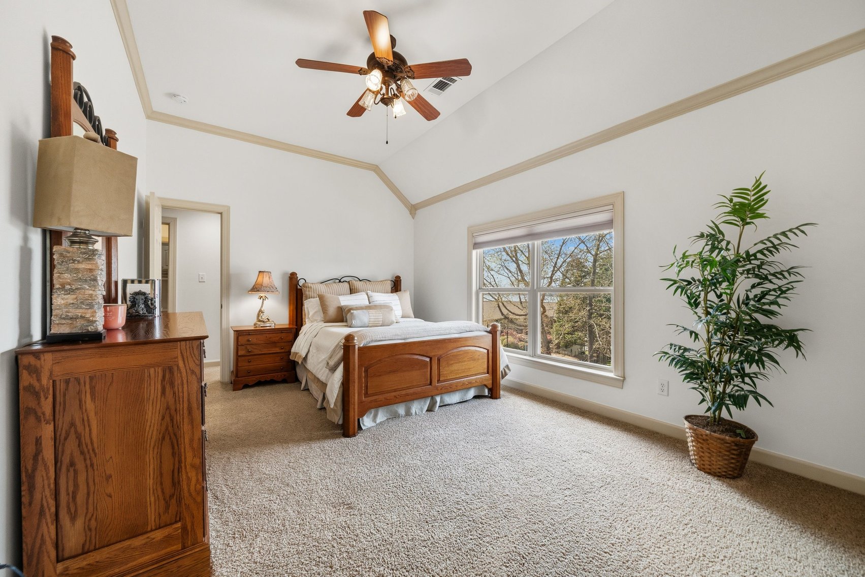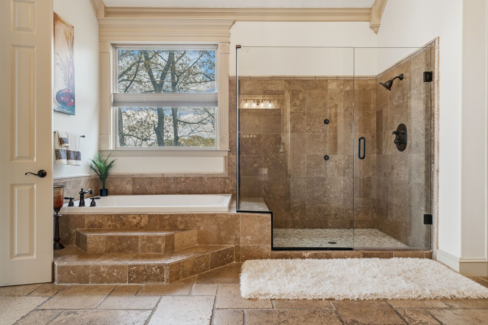 - Impressive Master Suite w/Tray Ceiling, Incredible Lake View & Private Bathroom w/Soaking Tub, Separate Tiled Shower, Dual Sink Vanity, Vanity Desk, Laundry Closet & Huge Walk-in Closet