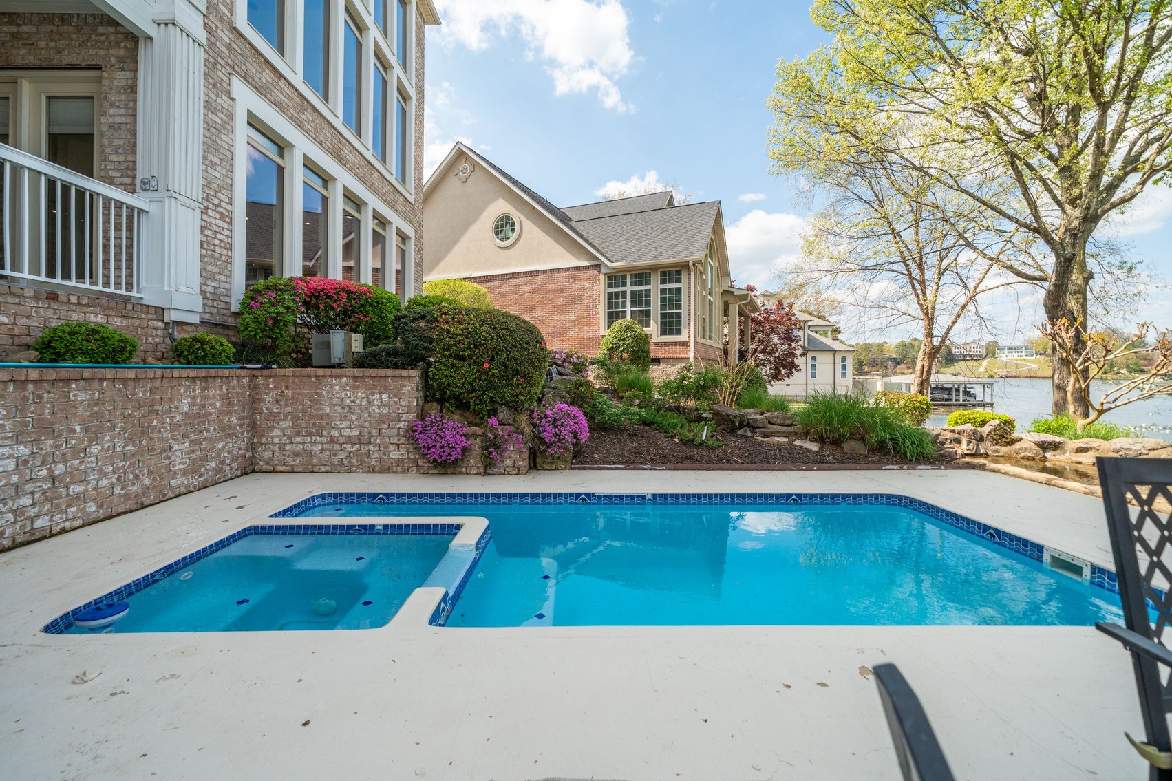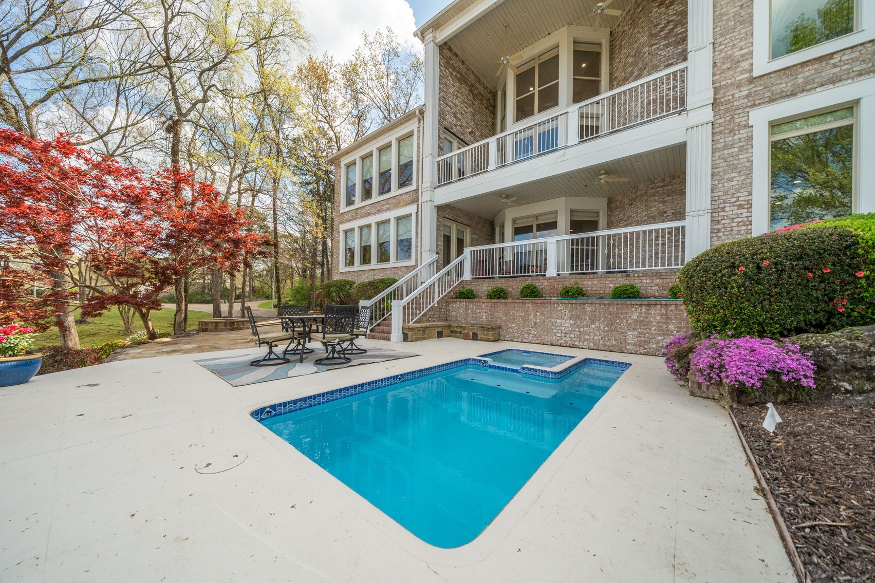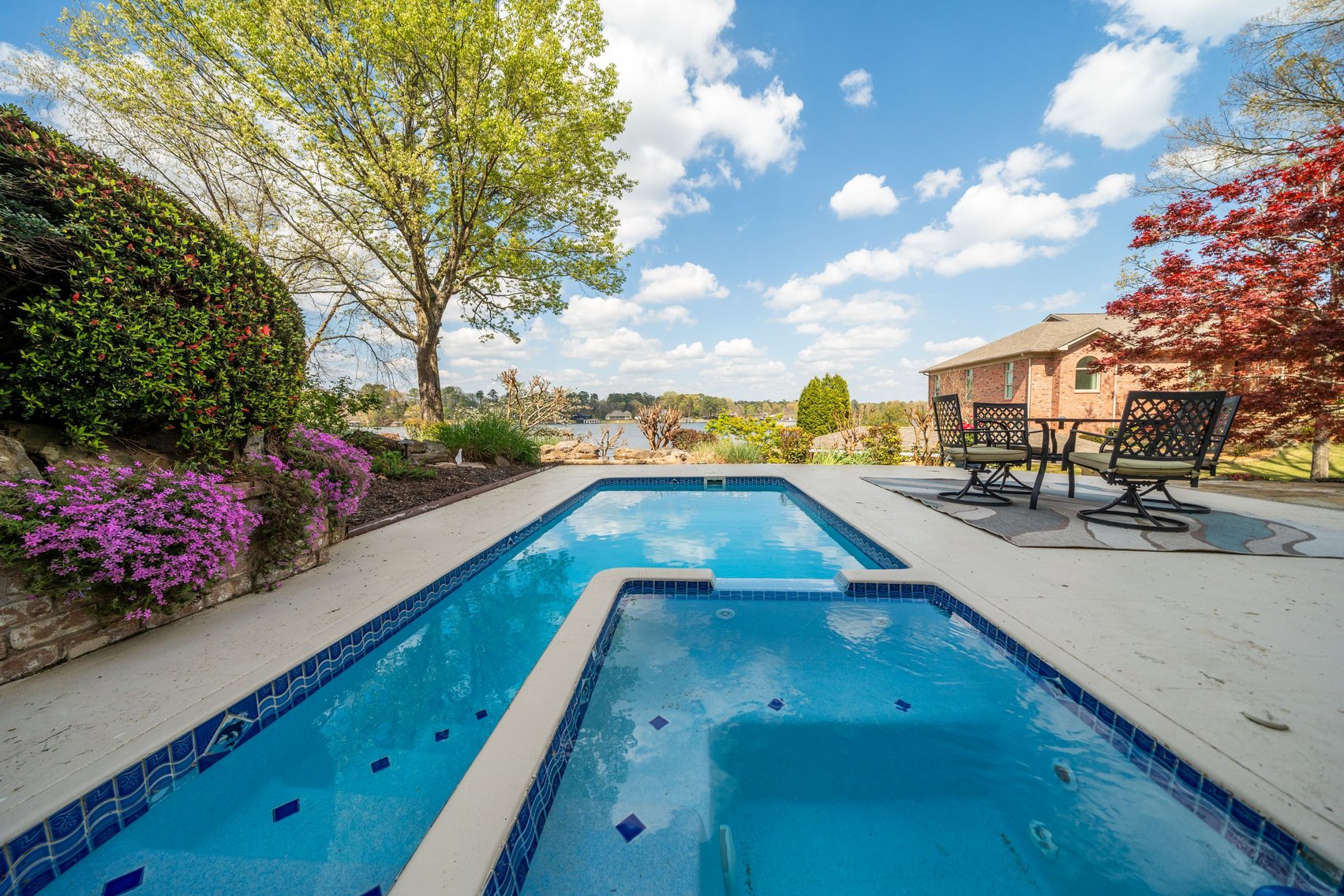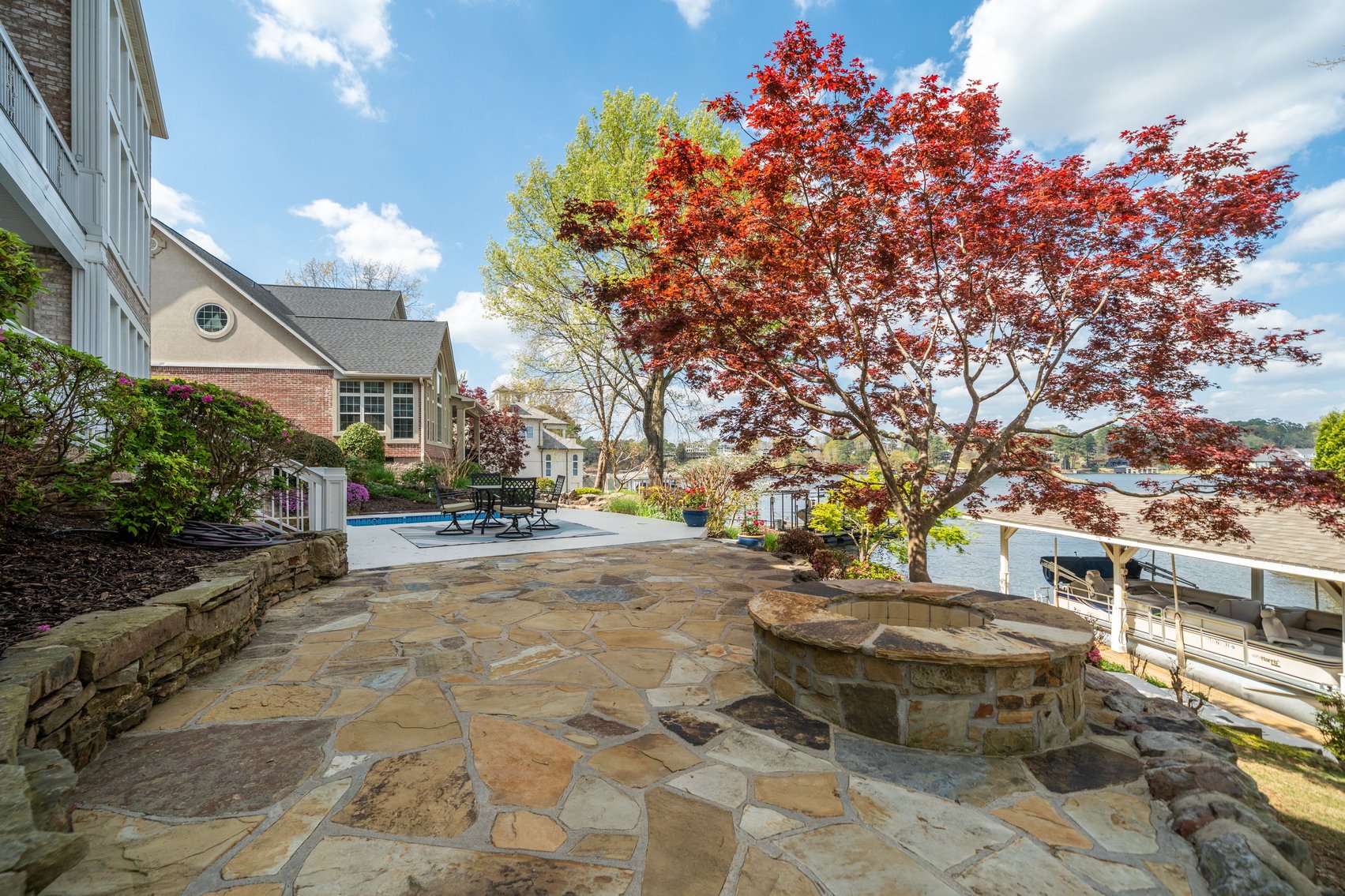 - In-Ground Pool w/Spillover Hot Tub, Poured Concrete Pool Deck & Adjoining Flagstone Patio w/Fire Pit, Beautiful Flowerbeds & Ornamental Trees