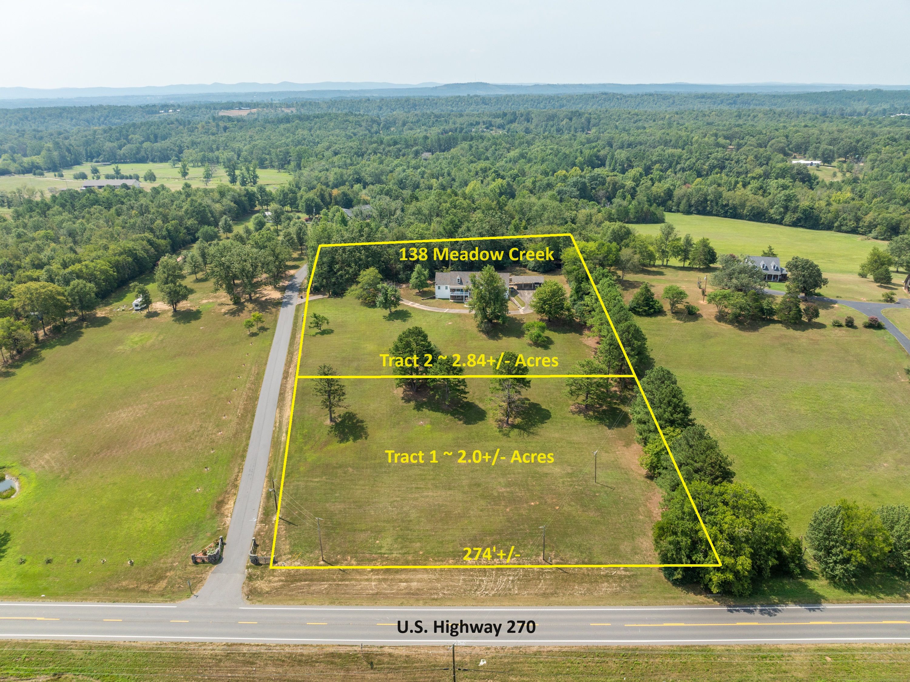 (TRACT 1) will be 2.0+/- Undeveloped Acres w/ 274’+/- Frontage on Highway 270 West w/an Average Daily Traffic Count of 5,000+/- Vehicles Per Day ~ Tract is Cleared & Mostly Level Overlooking the Highway ~ 274’+/- Wide & Approximately 300’ Deep ~ Electricity & City Water Available on HWY 270 & Meadow Creek Road Frontage.