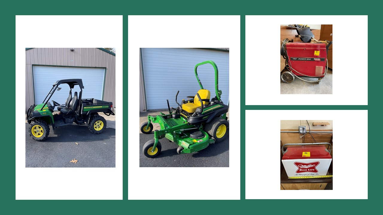 Over 200 Quality Items Including: 2014 John Deere 825E XUV Gator, John Deere Z950M Commercial Zero-Turn Mower, Lincoln Mig Welder, Power Tools, NASCAR & Miller High Life Collectibles, Solid Oak Furniture, Tools, Food Processing Appliances, New Refrigerator, Outdoor Furniture & Decorations & Much More!