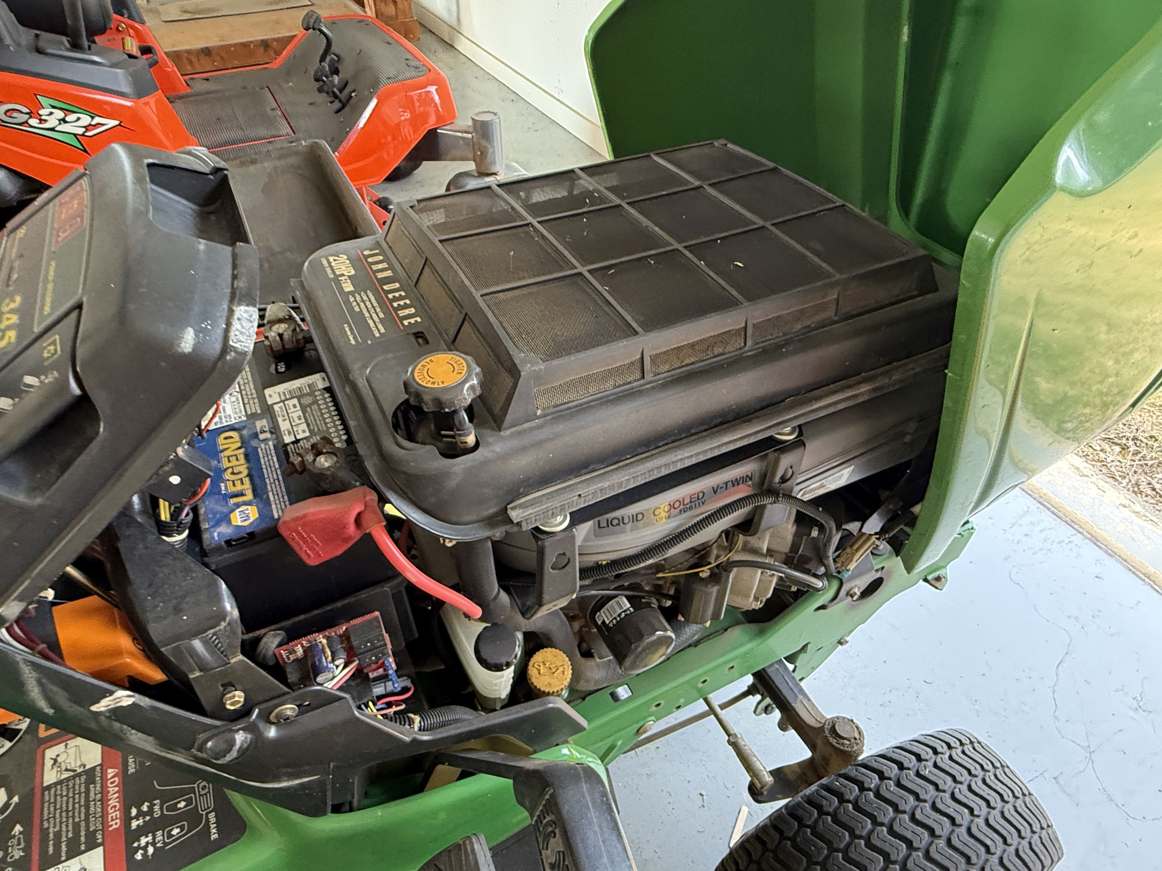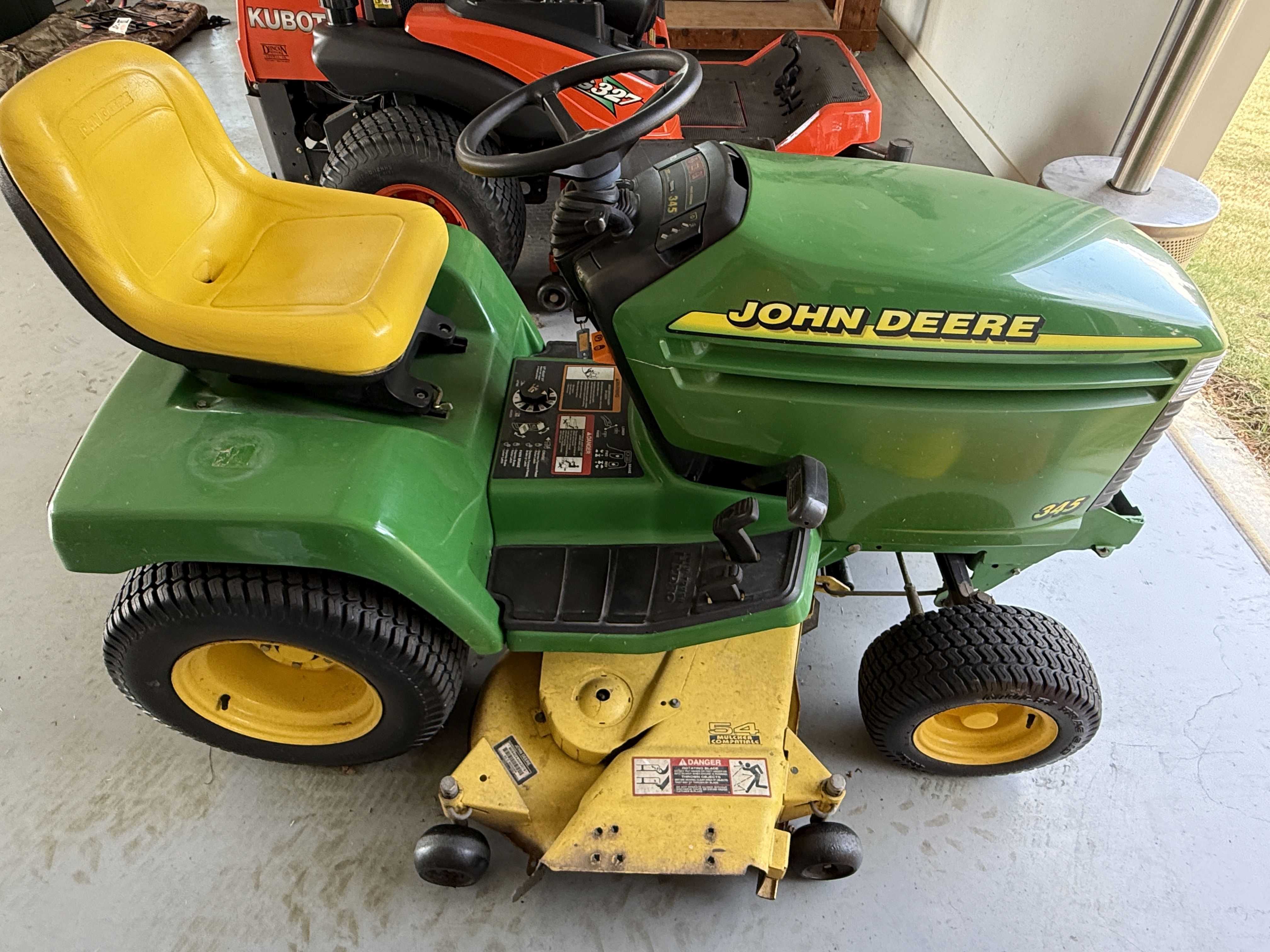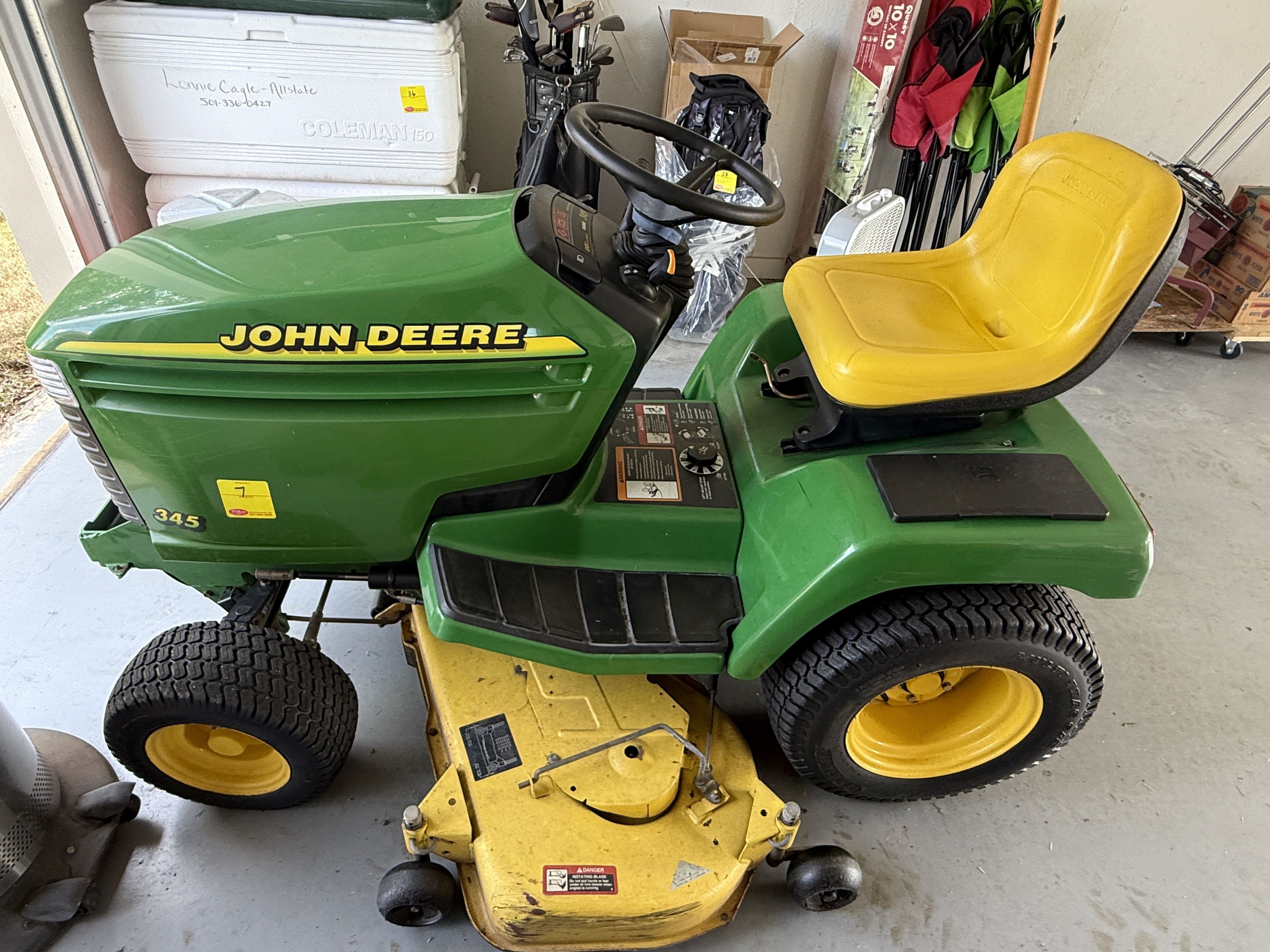 7 John Deere 345 Lawn Tractor, 54" Deck, 440Hrs, 20HP V Twin Liquid Cooled, Recent Service Includes, Clutch Replaced, Volt Regulator, Air/Oil/Fuel Filter, Spark Plug, Transmission Belt, Drive Belt, Pulleys. Strong & Clean Machine! VIN M00345B099561