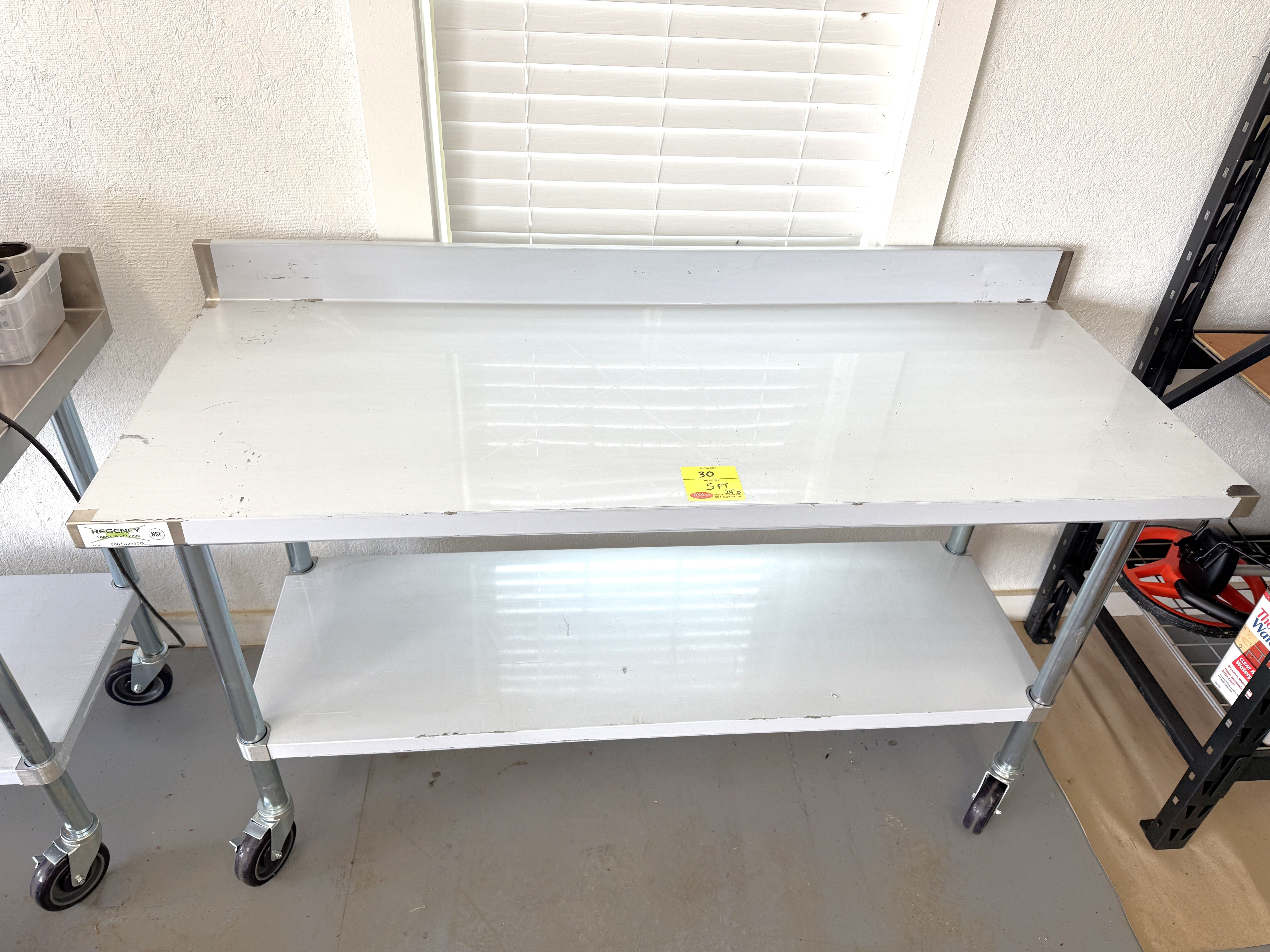 30 5 Ft Stainless Rolling Table on Casters. Protective sticker still applied