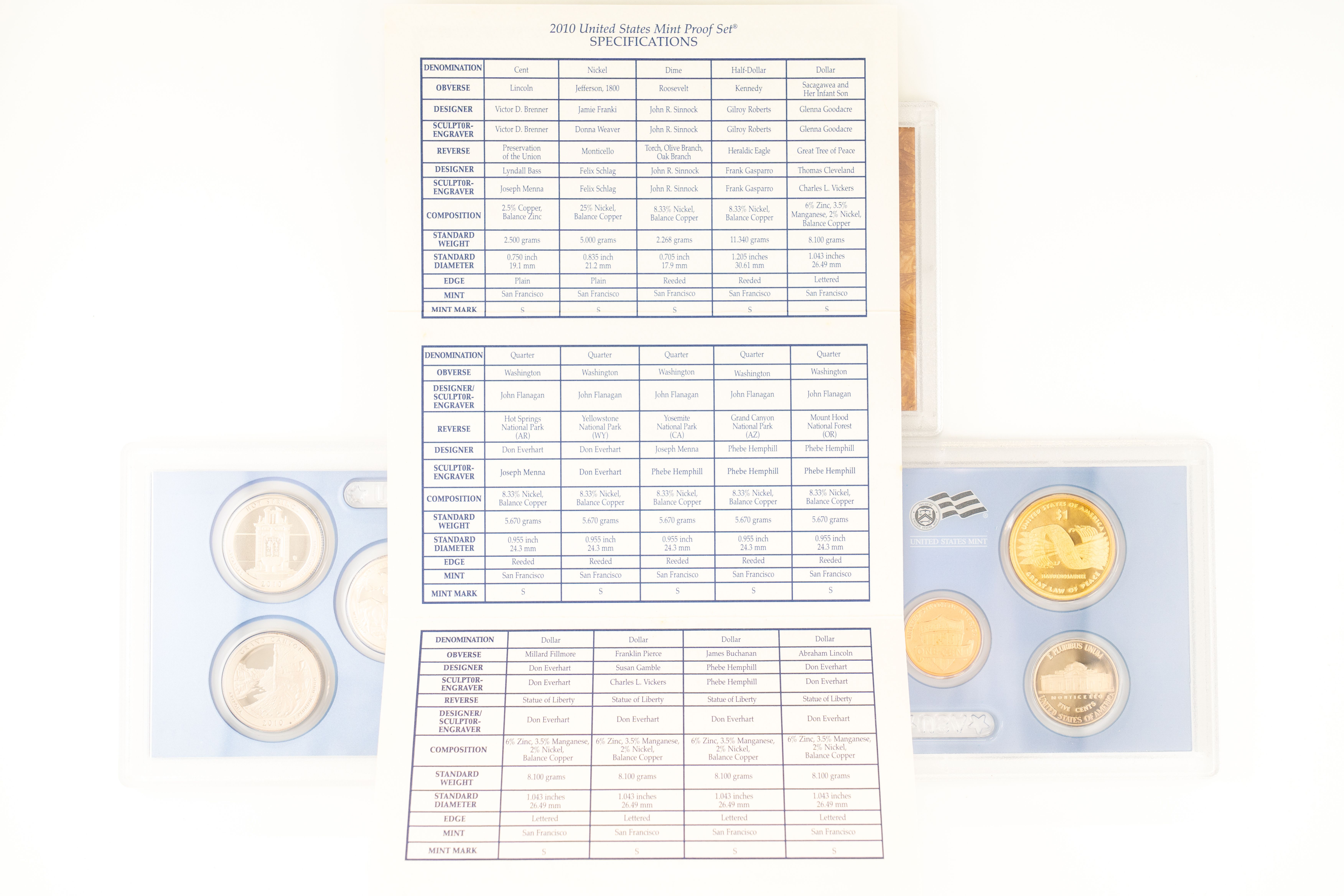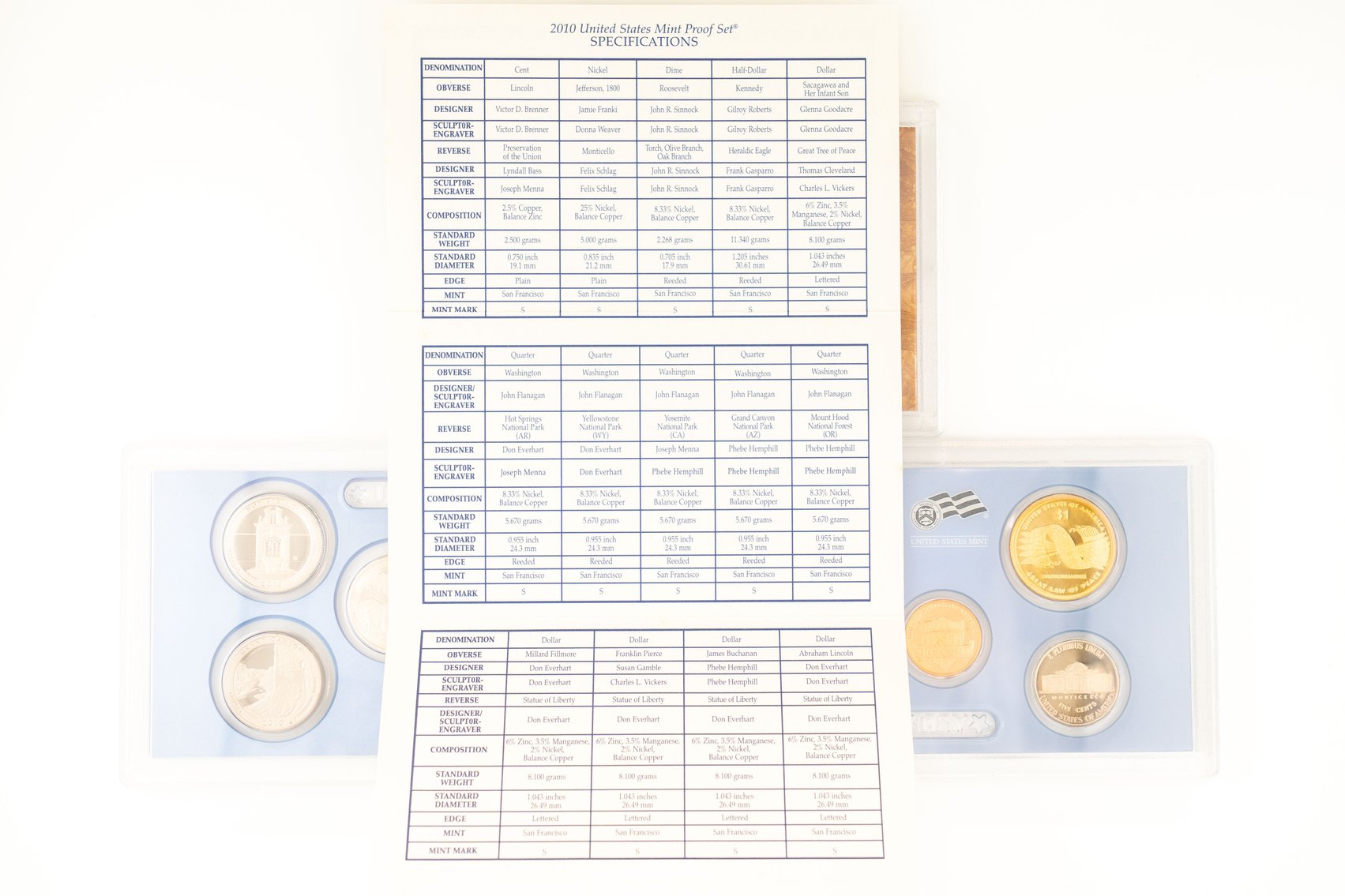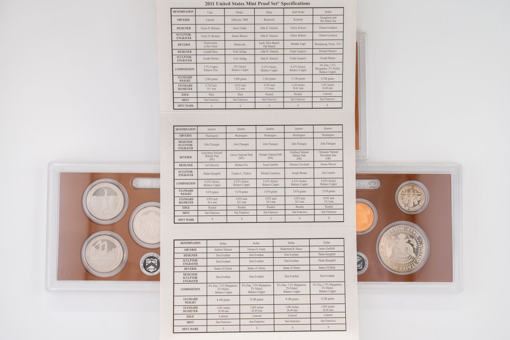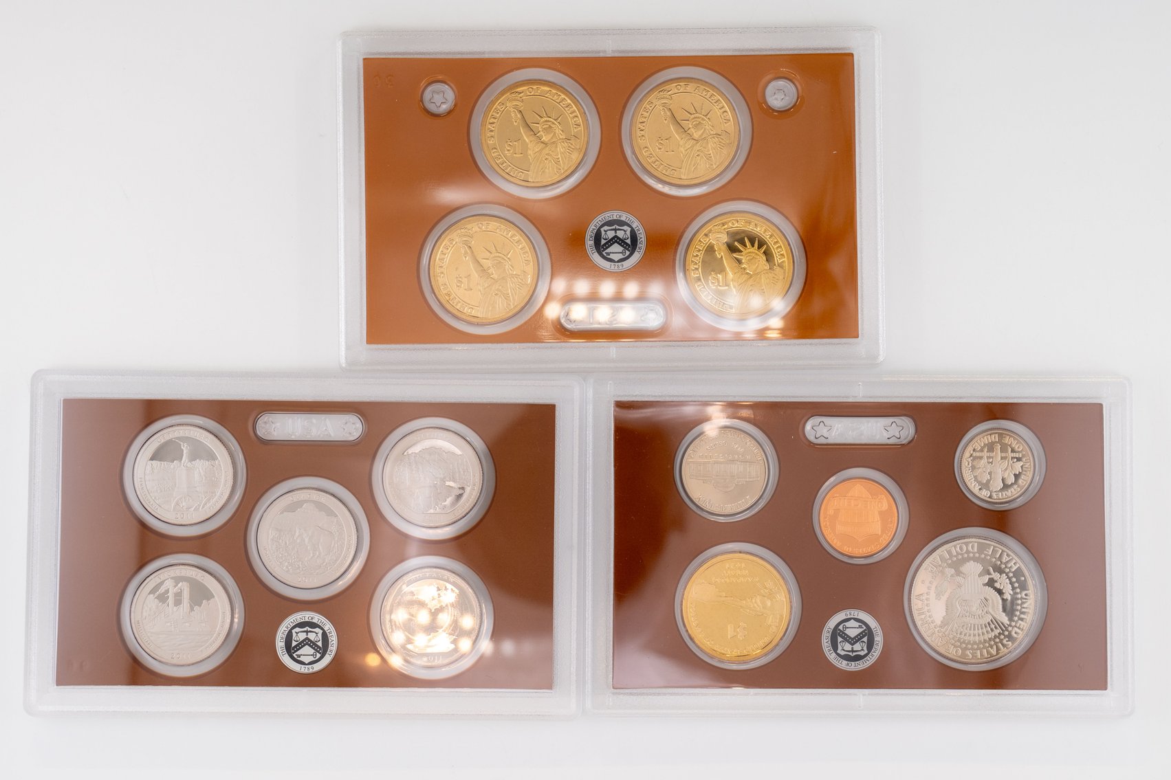 54 (2) Sets, Each 14 Coin Set Containing 99% Silver (5) Quarters, 1/2 Dollar, Dime. (5) $1 Coins. United States Silver Proof Sets, 2010-S,2011