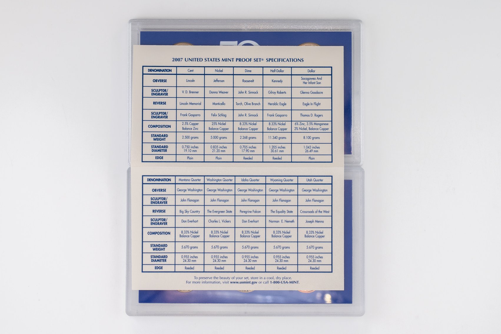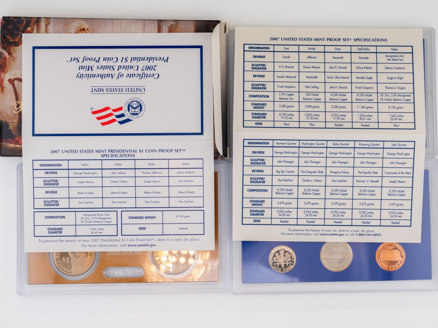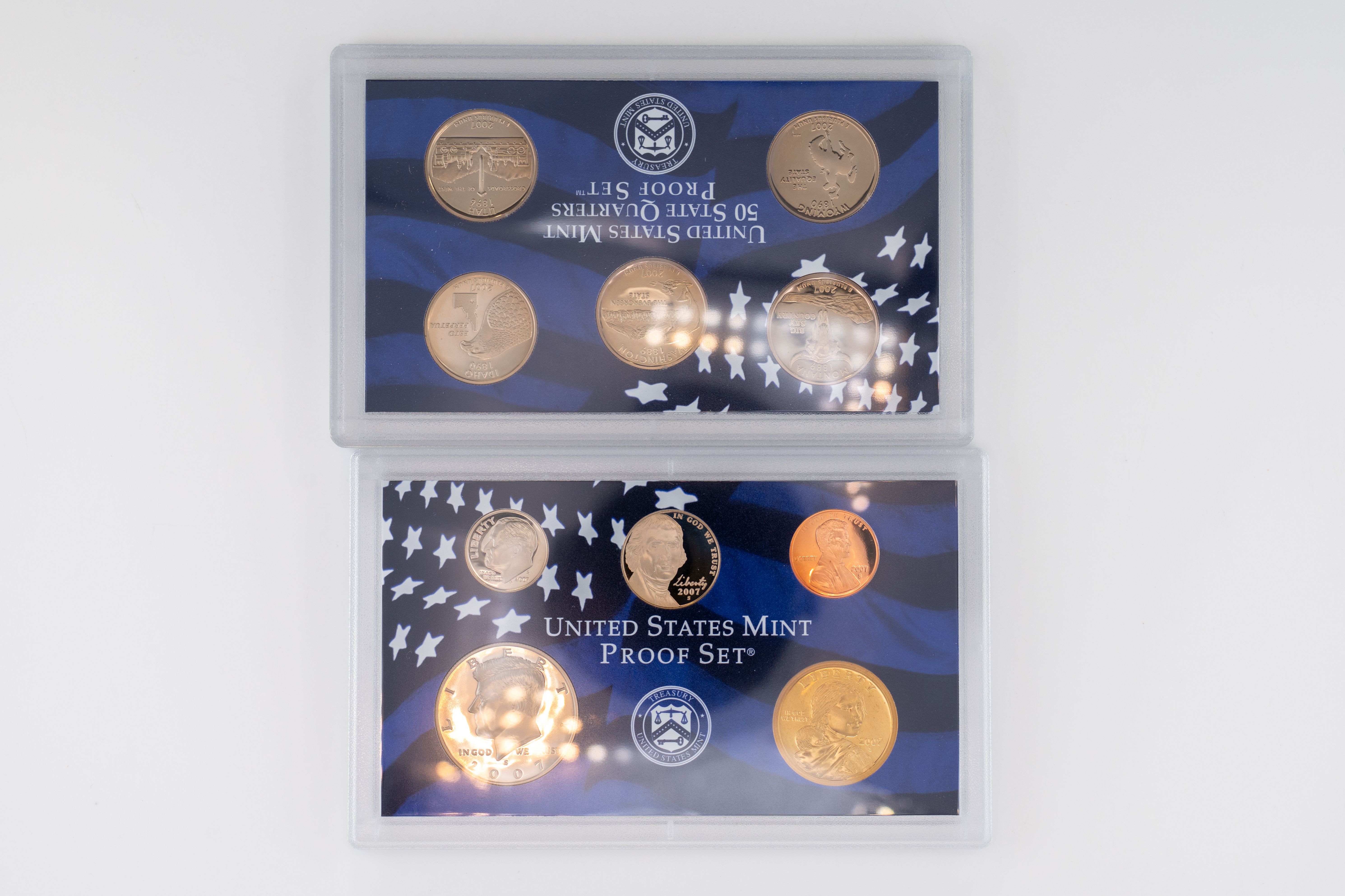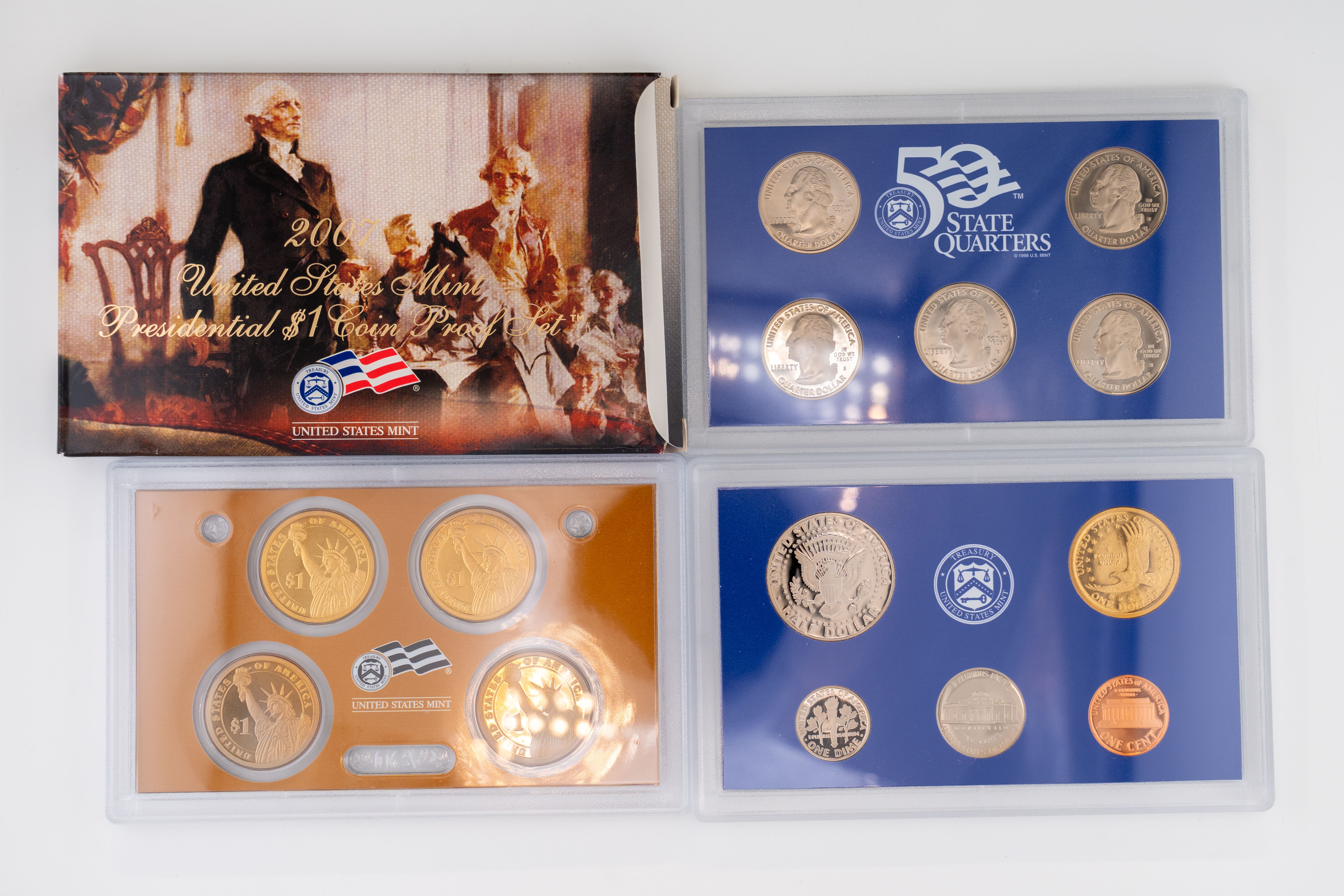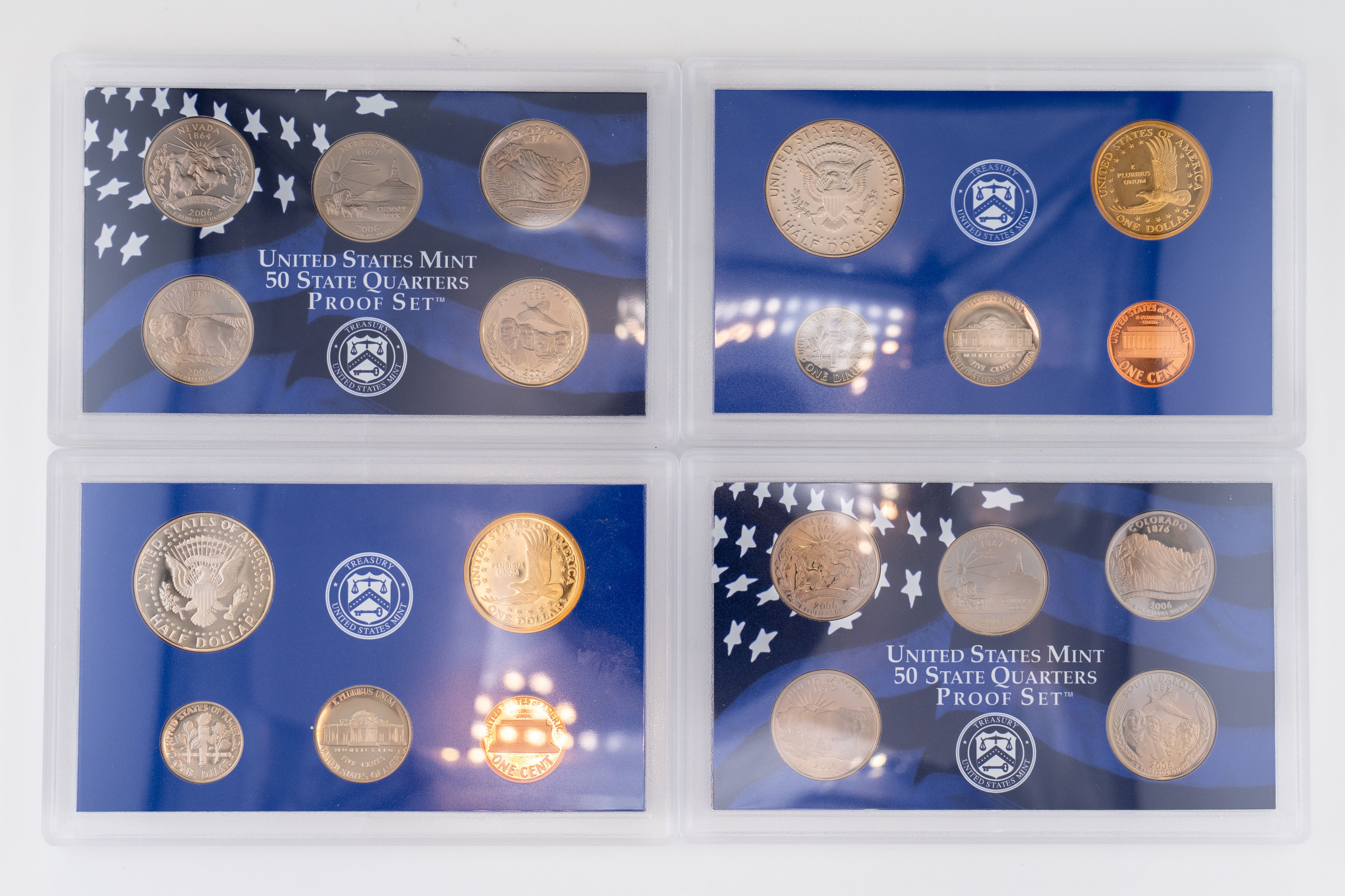 57 (2) Sets, Each Coin Set Containing 99% Silver (5) Quarters, 1/2 Dollar, Dime. United State Silver Proof Sets. 2006, (14) Coin 2007 set contains (5) $1 Coins