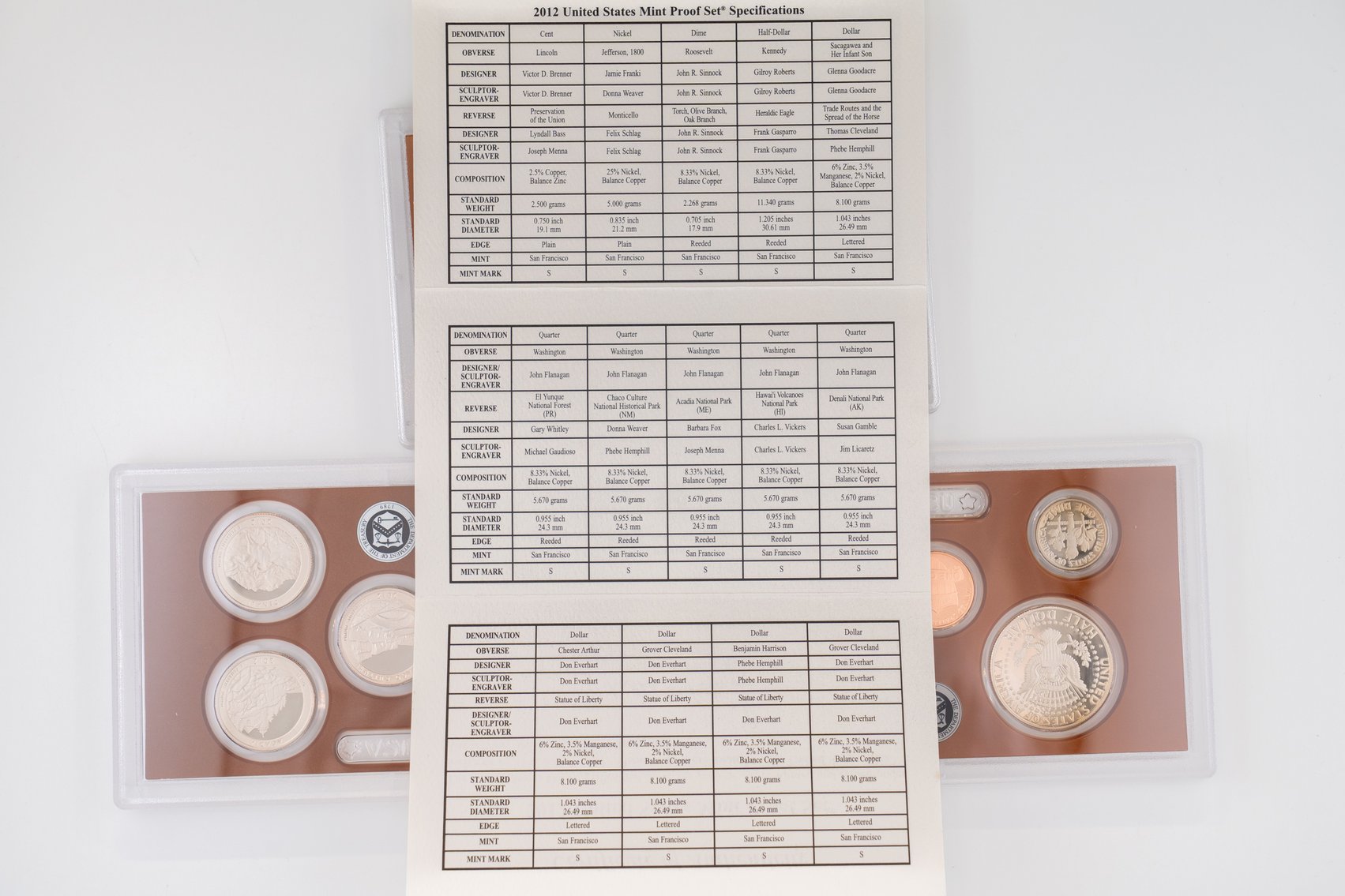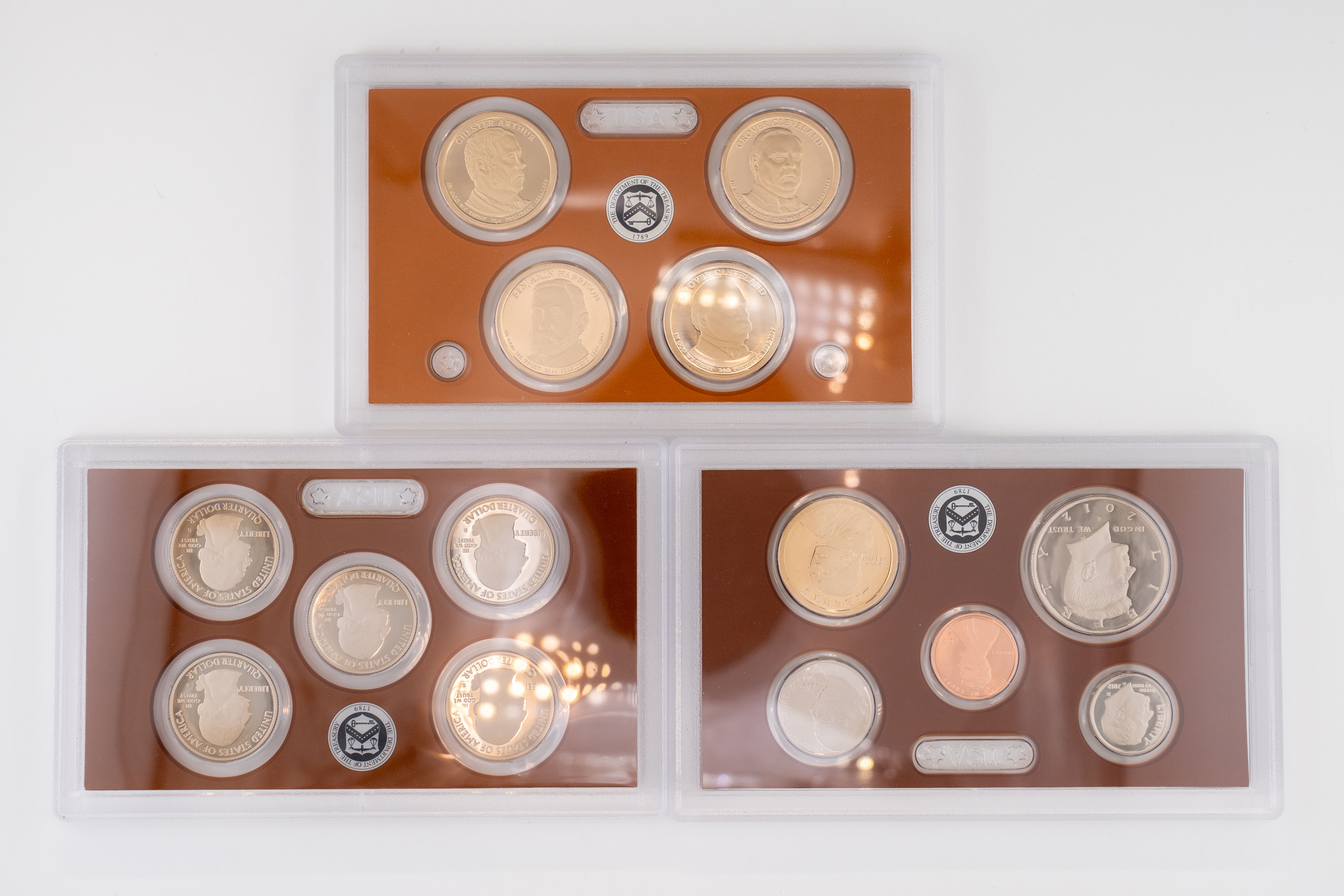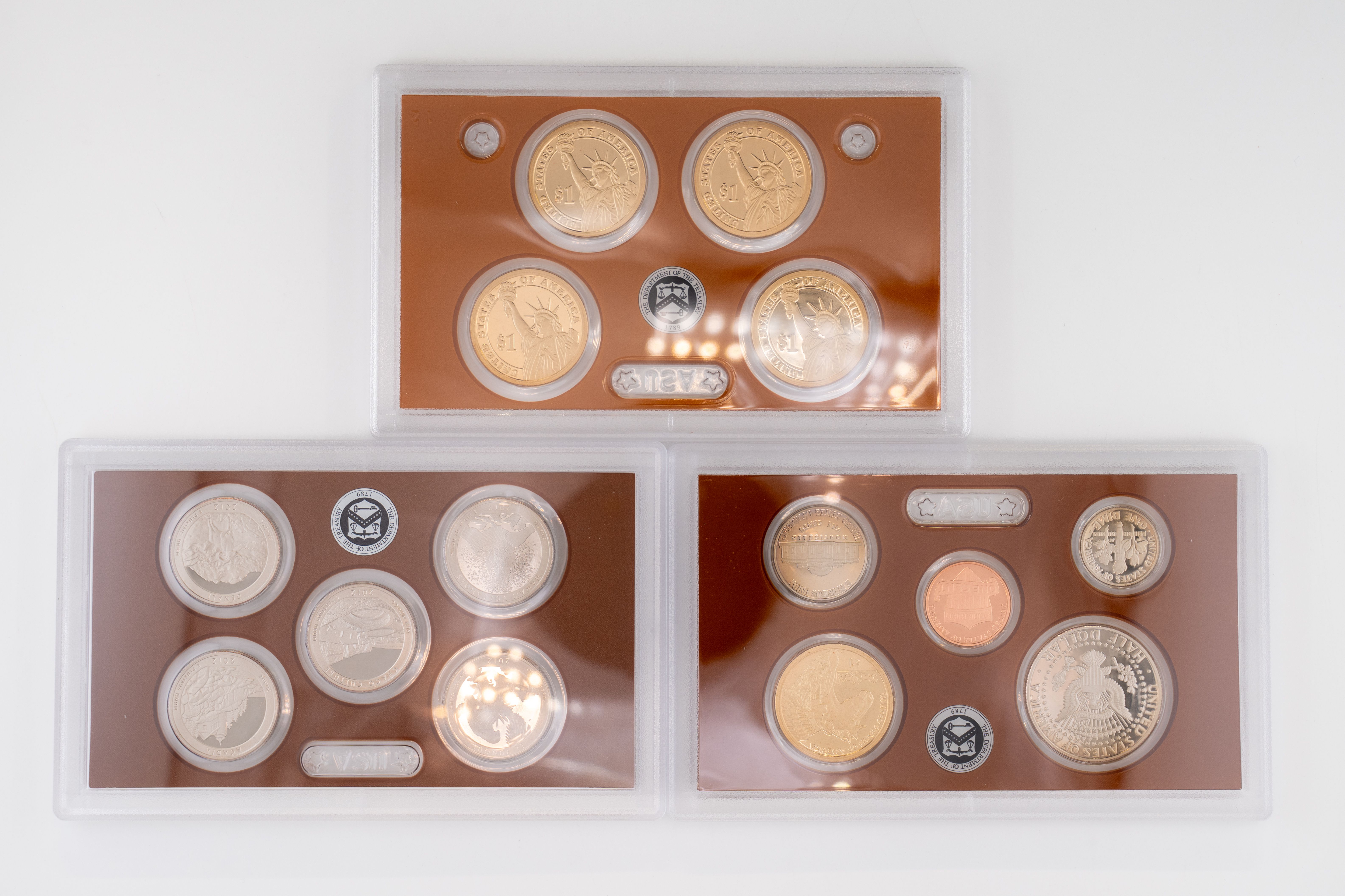 53 (2) Sets, Each 14 Coin Set Containing 99% Silver (5) Quarters, 1/2 Dollar, Dime. (5) $1 Coins. United States Silver Proof Sets, 2012, 2013