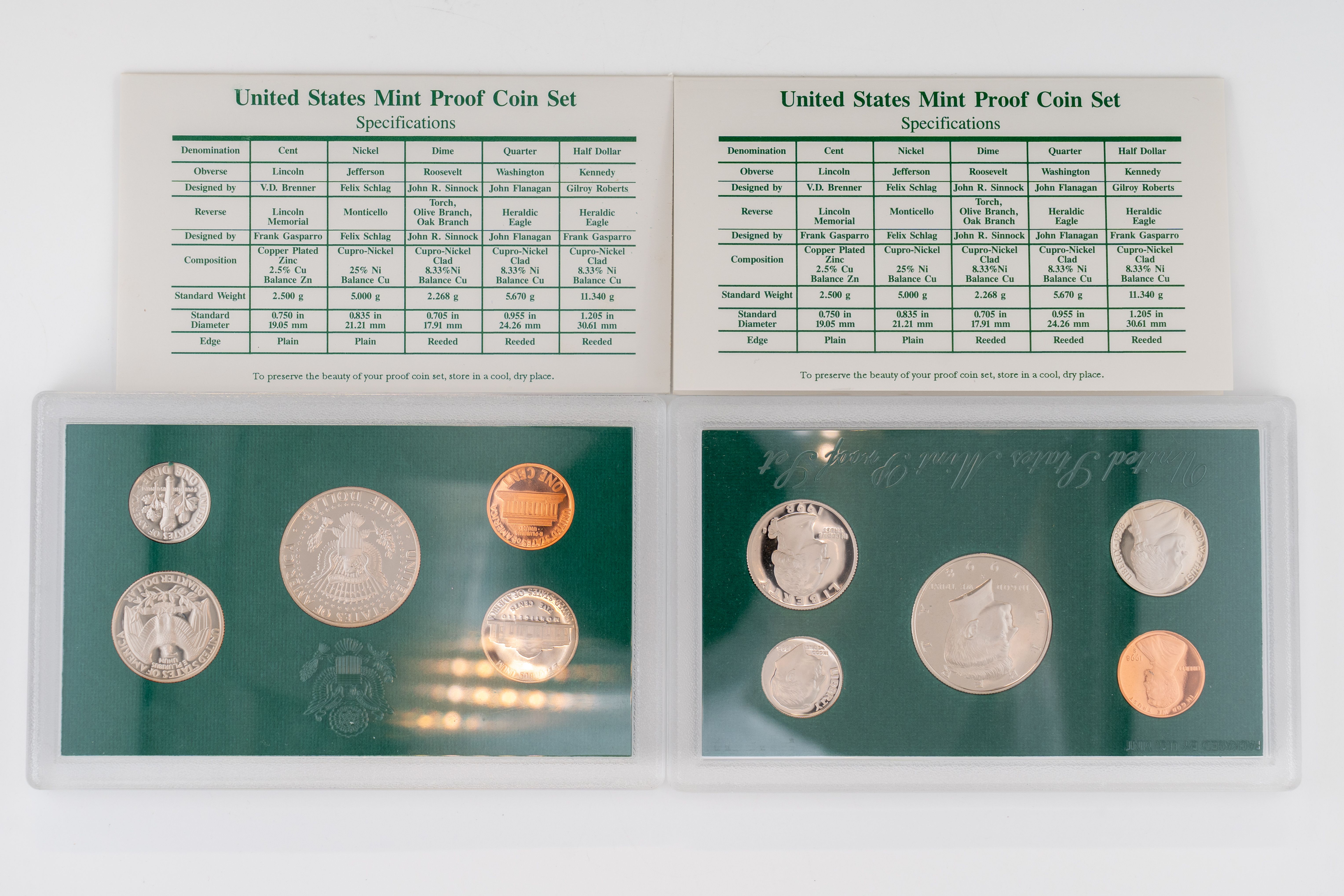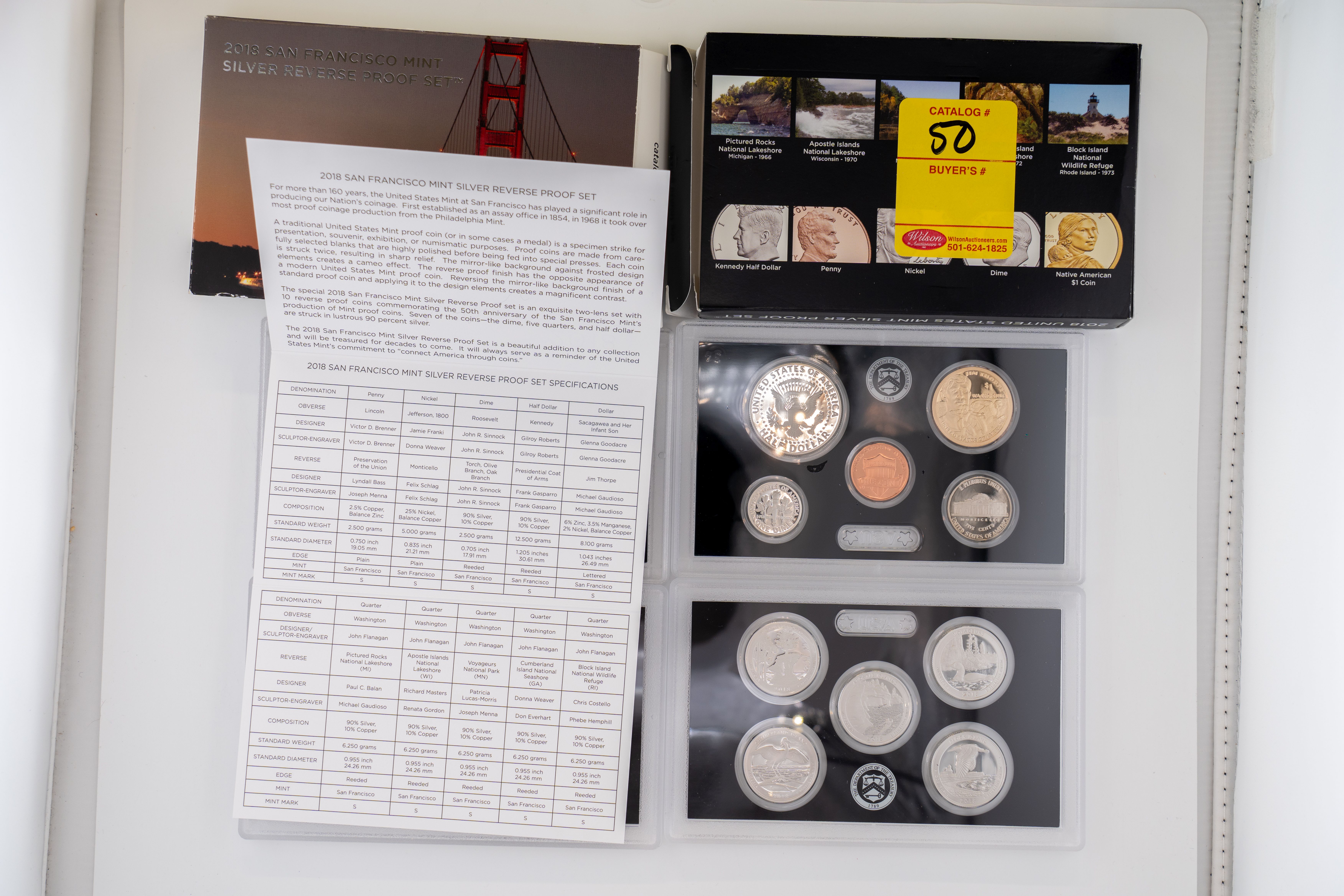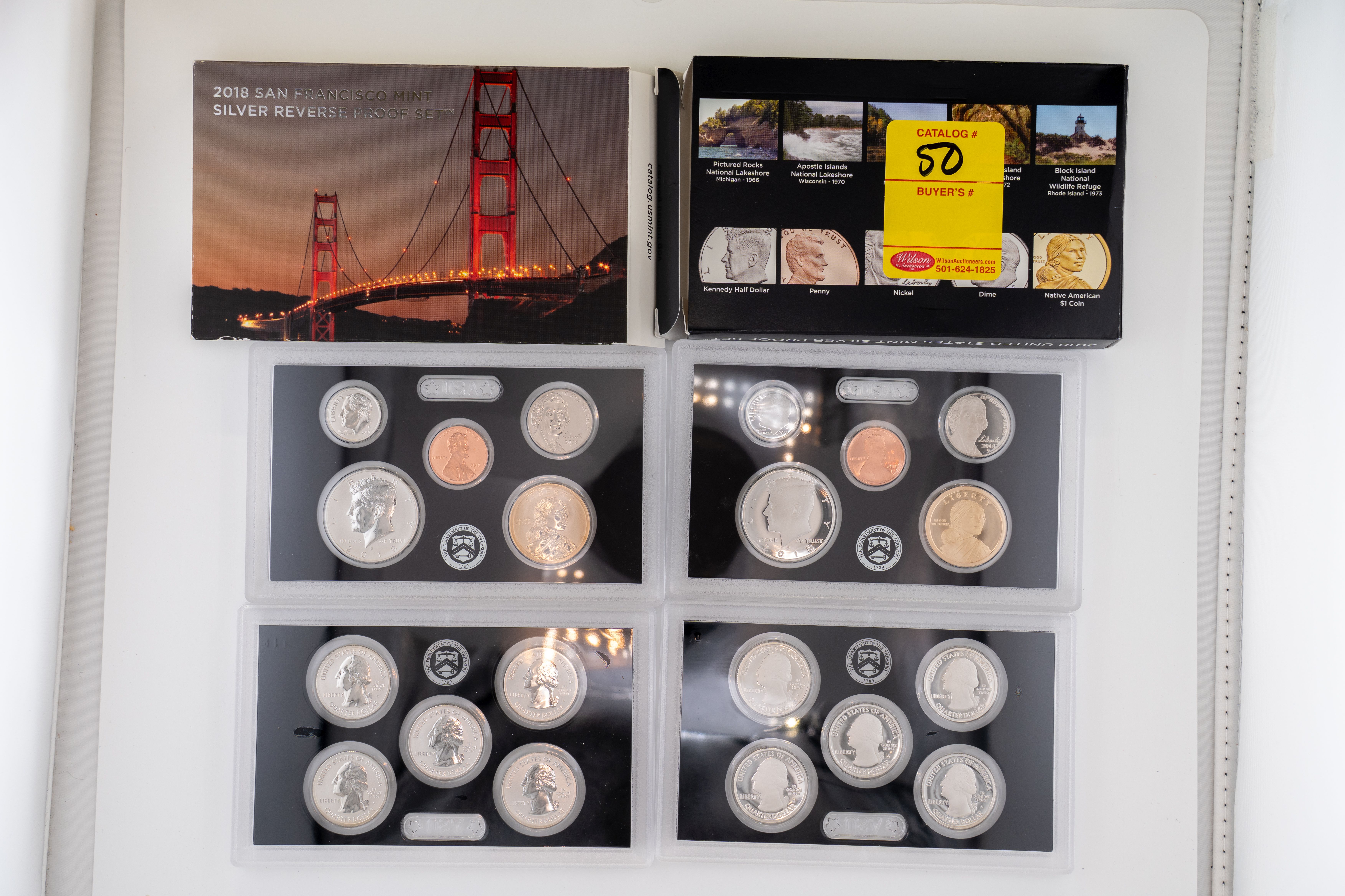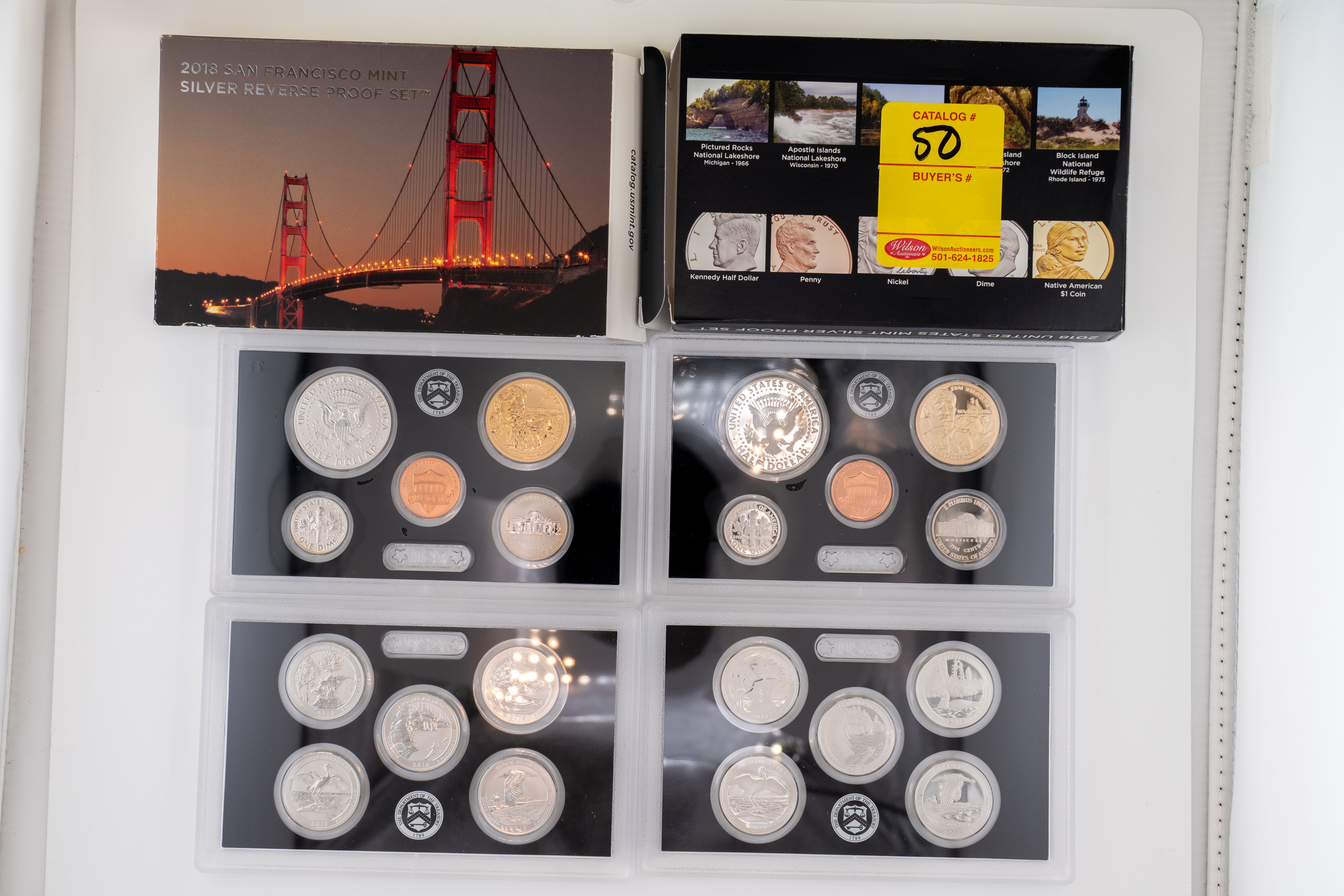 50 (2) Sets, Each 10 Coin Set Containing 99% Silver (5) Quarters, 1/2 Dollar, Dime. United States Silver Proof Set & Reverse Set 2018