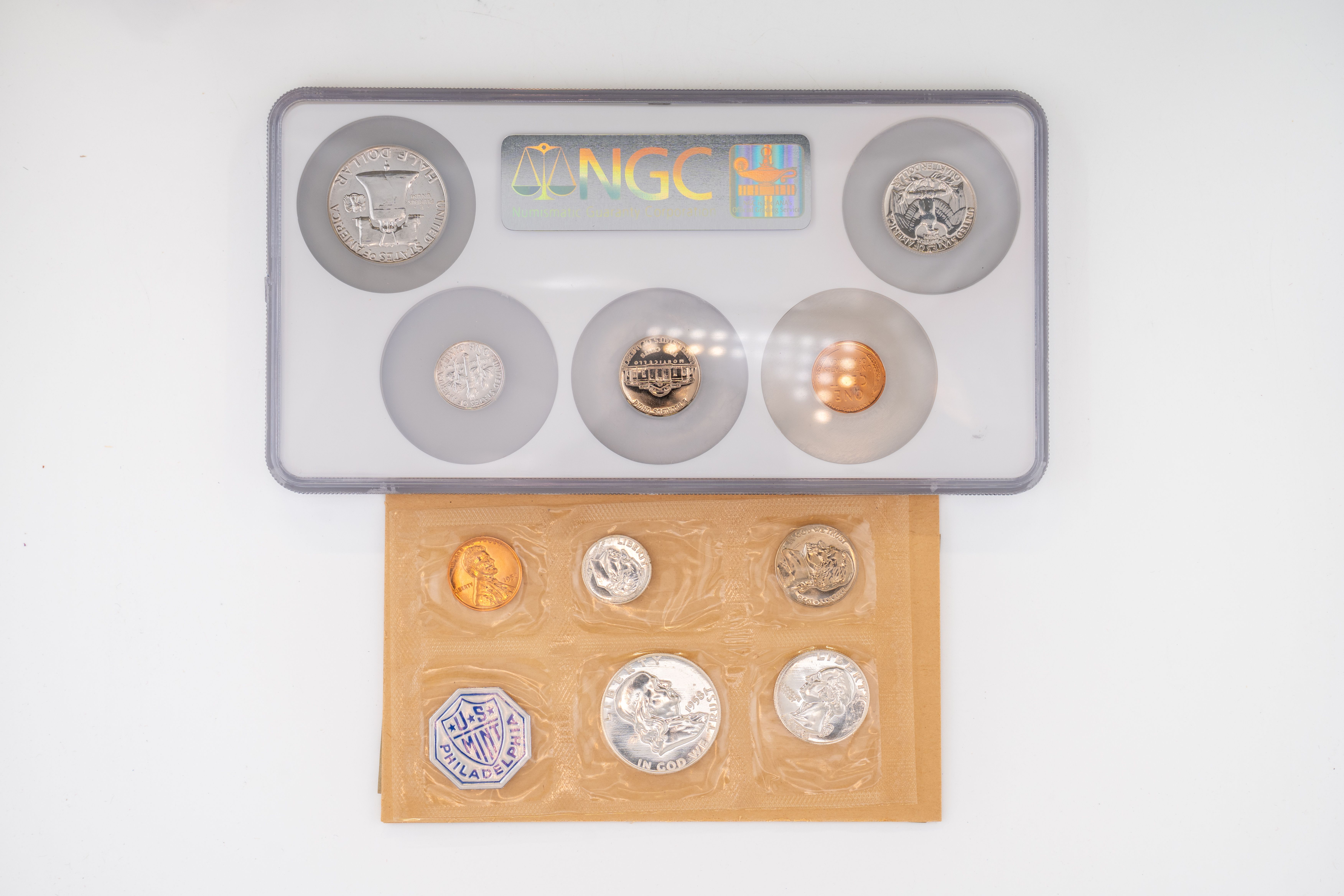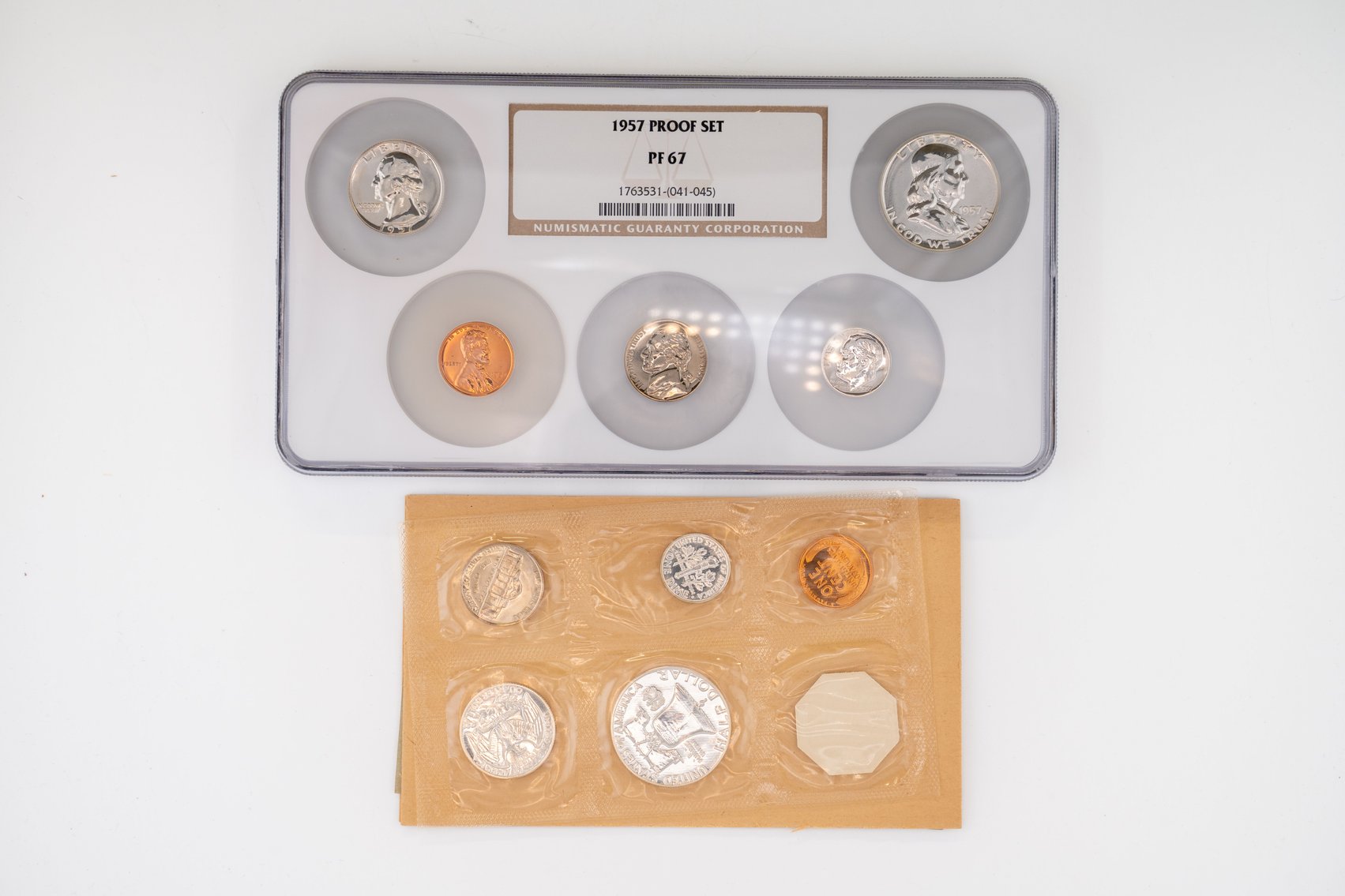 44 (2) US Mint Proof Sets 1957P Encapsulated and Graded PF67, 1958P. Silver Half Dollar, Quarter, and Dime in Each