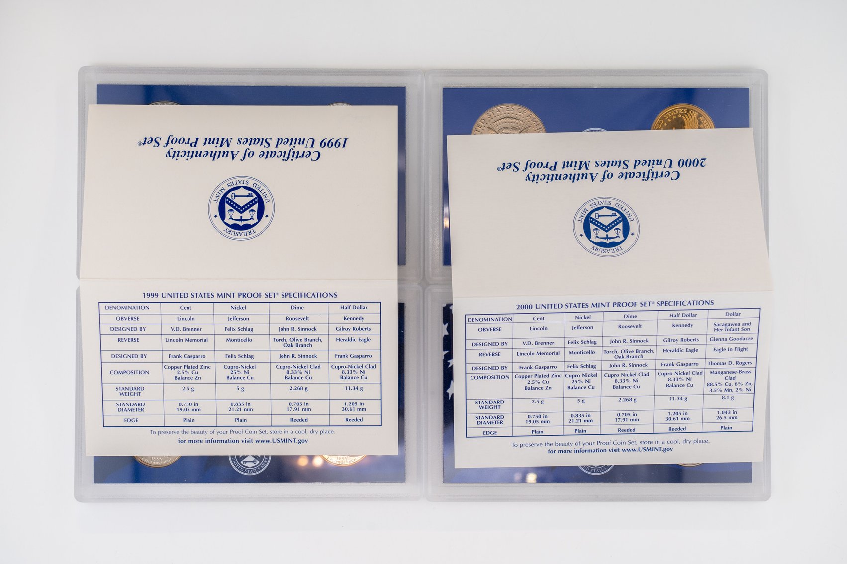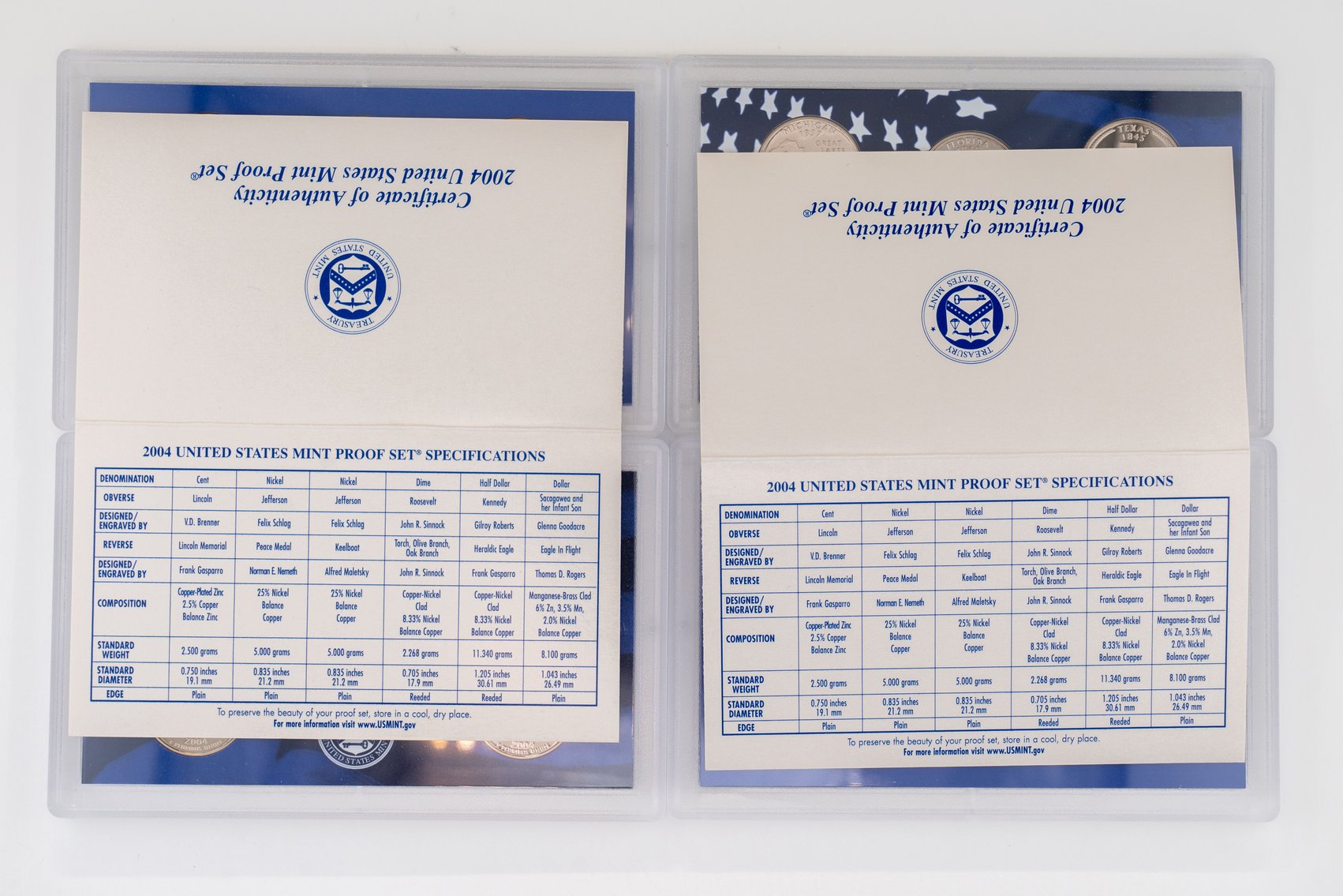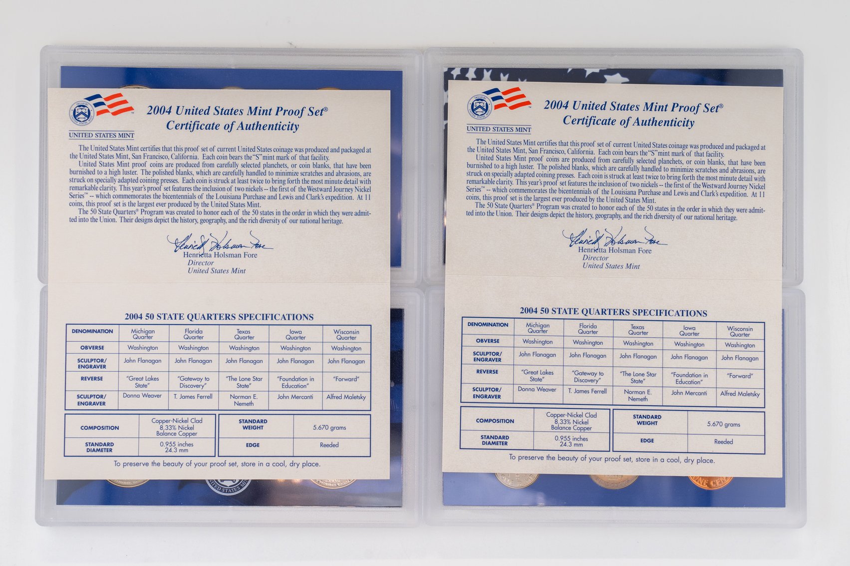 59 (2) Sets, Each 10 Coin Set Containing 99% Silver (5) Quarters, 1/2 Dollar, Dime. United States Silver Proof Sets 2004, 2005