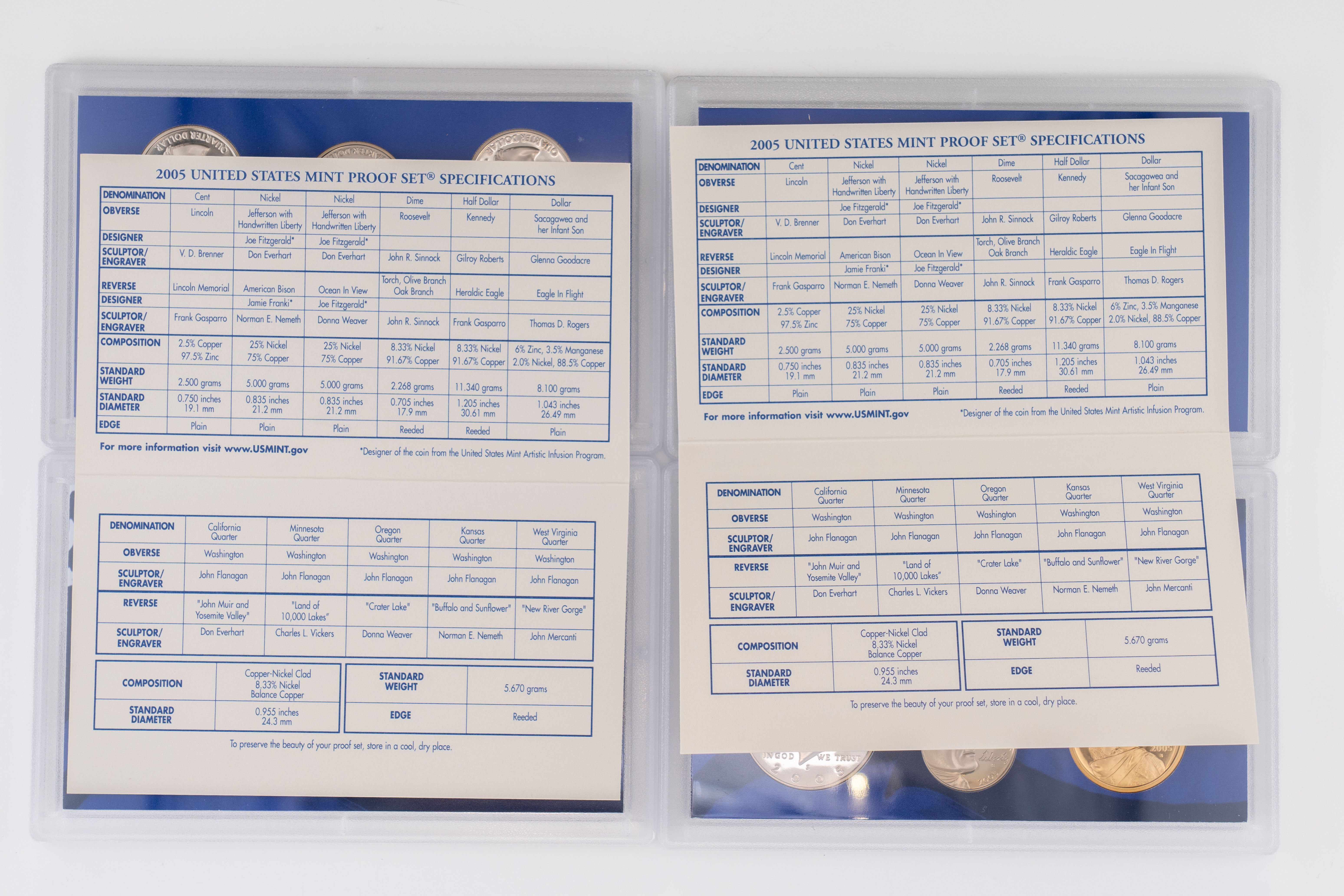 58 (2) Sets, Each 10 Coin Set Containing 99% Silver (5) Quarters, 1/2 Dollar, Dime. United States Silver Proof Sets 2005, 2006