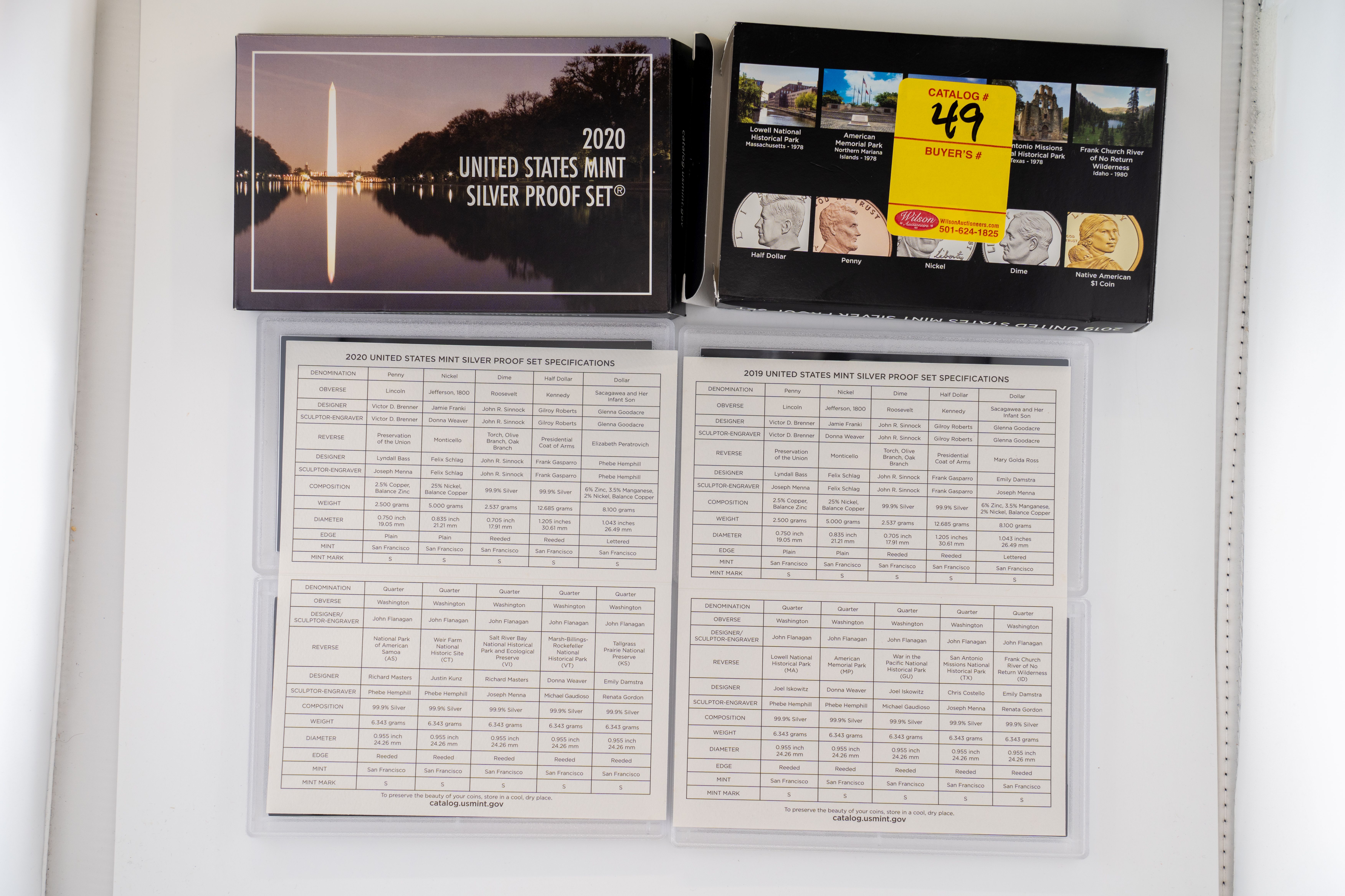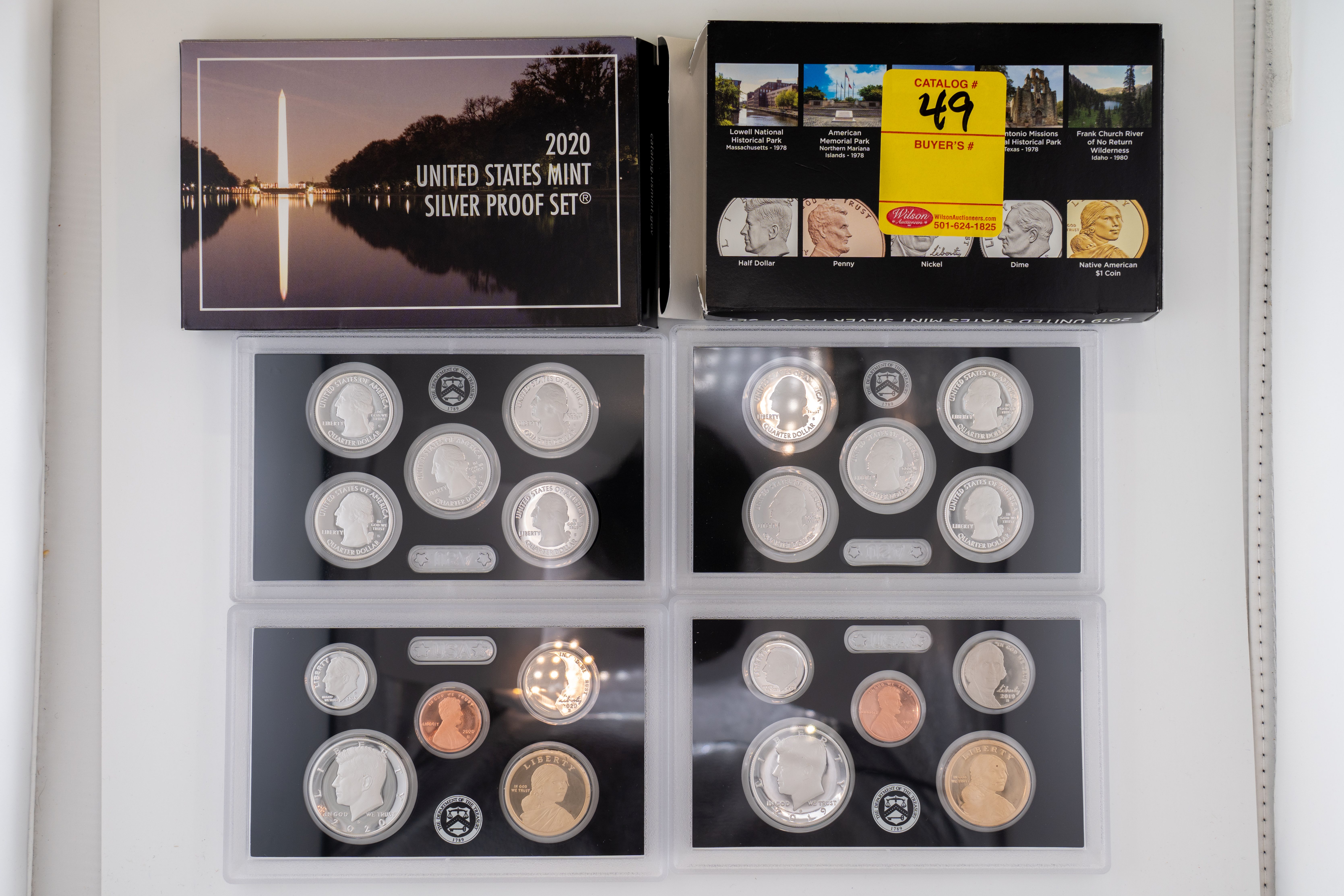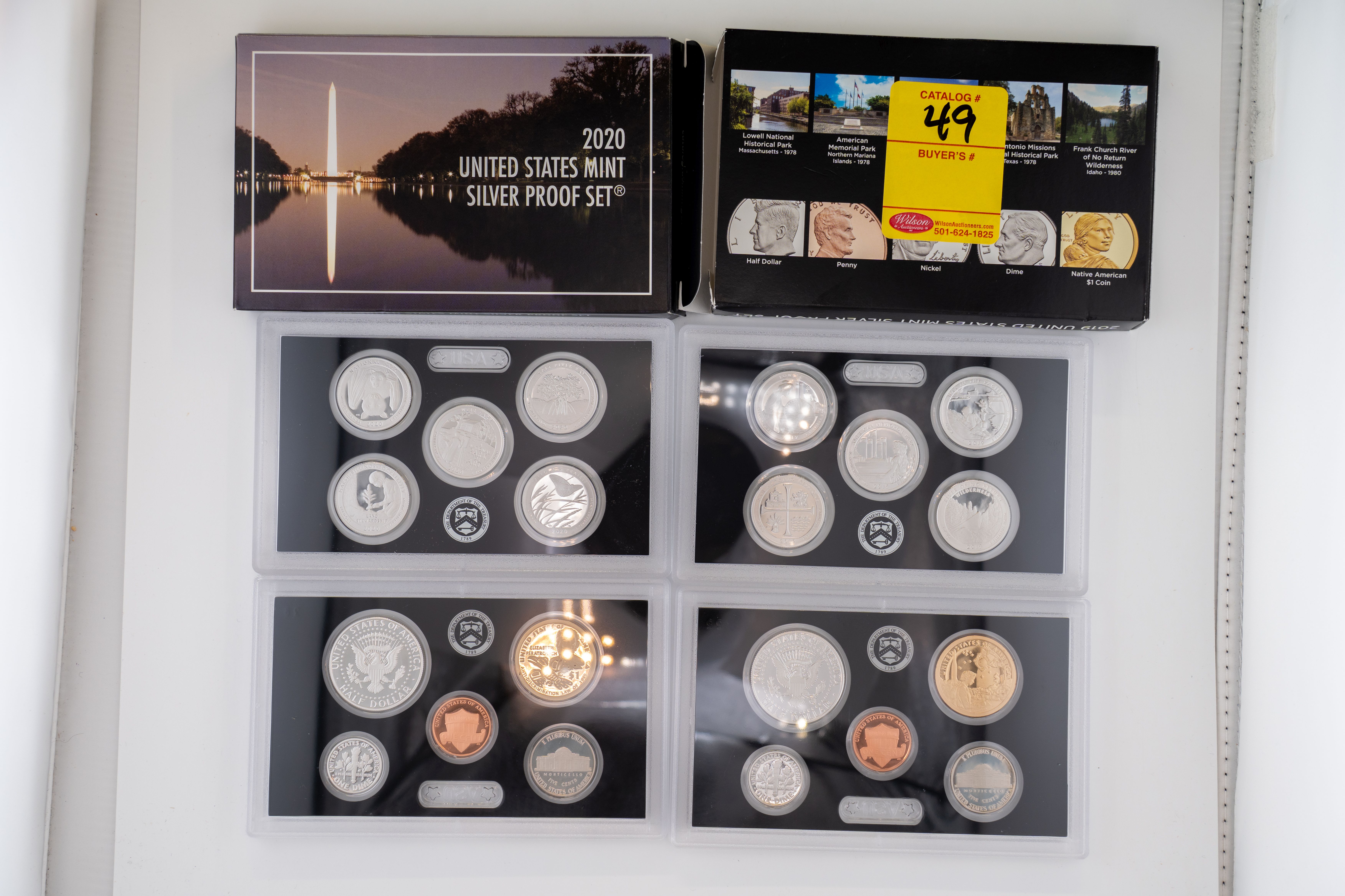 49 (2) Sets, Each 10 Coin Set Containing 99% Silver (5) Quarters, 1/2 Dollar, Dime. United States Silver Proof Sets 2019,2020