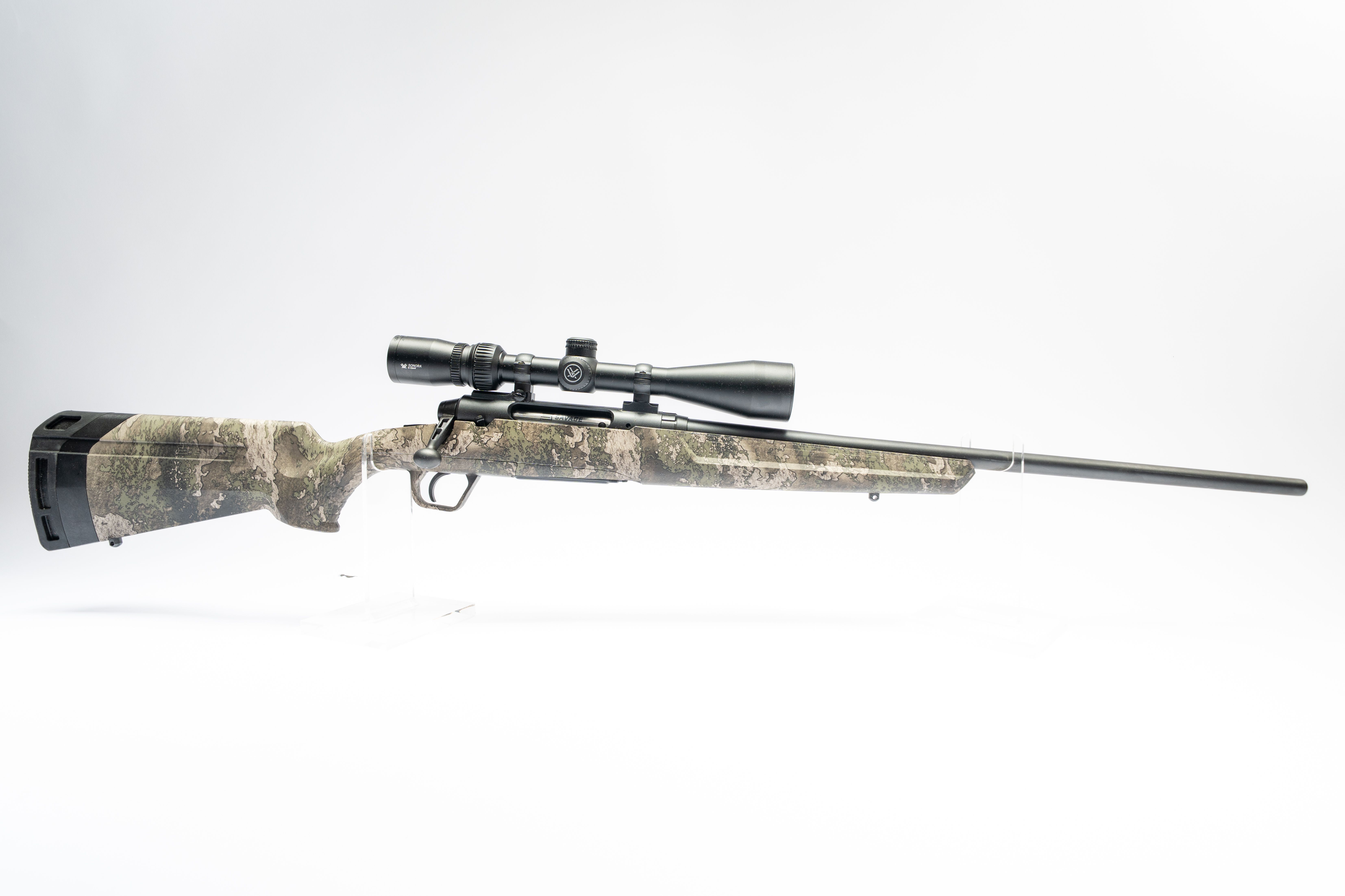 28 Savage Axis 6.5 Creedmoor Bolt Action, Camo Stock, Like New. Sonora 4-12x44 Scope, SN P243271